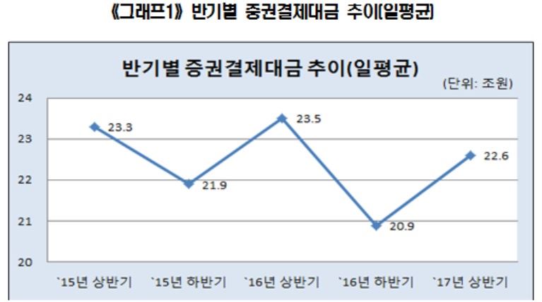 상반기 장내 주식시장 결제대금은 일평균 4941억원으로 직전 반기 대비 8.8% 증가했다. 거래대금이 직전 반기 대비 5.7% 증가함에 따라 결제대금도 늘었다. 장내 채권시장 결제대금은 일평균 1조5000억원으로 직전 반기 대비 1.2% 증가했다. 거래대금이 직전 반기 대비 30.2% 감소했음에도 결제대금이 소폭 증가한 것은 대금 차감률이 직전반기 대비 4.0%포인트 감소함으로써 거래대금 감소율을 일부 상쇄시켰기 때문이다. 장외 주식기관결제대금은 일평균 7008억원으로 직전 반기 대비13.6% 증가했다. 거래대금의 직전 반기 대비 증가율(20.1%) 대비 결제대금 증가율(13.6%)이 그에 미치지 못한 것은 대금 차감률이 직전 분기 대비 0.8%포인트 증가에 그쳤기 때문이다. 장외 채권기관결제대금은 일평균 19조9000억원으로 직전 반기 대비 8.0% 증가했으며 이는 증권결제대금 일평균 총액(22조6000억원)의 88.2%를 차지했다. 일평균 11조2000억원으로 직전반기 대비 8.9% 증가했고, 전년 동기 대비 5.3% 감소했다. 양도성예금증서(CD)·기업어음(CP) 결제대금은 일평균 5조2000억원으로 직전 반기 대비 12.4% 증가했고 전년 동기 대비 2.1% 증가했다. 전자단기사채 결제대금은 일평균 3조5000억원으로 직전반기 대비 0.5% 감소했고 전년 동기 대비 8.7% 감소했다.채권 종류별 결제대금을 살펴보면 국채가 일평균 5조4000억원(48.4%)으로 가장 많았고, 이어서 통안채 2조8000억원(25.0%), 금융채 1조8000억원(16.0%), 특수채 5000억원(4.7%), 회사채 3000억원(2.3%) 순이었다. 박나영 기자 bohena@asiae.co.kr<ⓒ세계를 보는 창 경제를 보는 눈, 아시아경제(www.asiae.co.kr) 무단전재 배포금지>