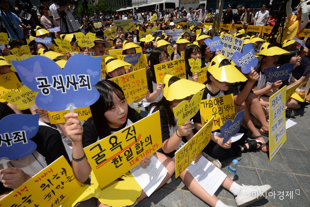 [아시아경제 문호남 기자] 26일 서울 종로구 옛 주한 일본대사관 앞 평화로에서 열린 제1293차 일본군 성노예제 문제해결을 위한 정기 수요시위에 참가한 시민들이 일본 정부의 공식 사죄를 촉구하는 손팻말을 들고 있다. 지난 23일 김군자 할머니의 별세로 정부에 등록된 일본군 위안부 피해 할머니 238명 가운데 생존자는 37명으로 줄었다.문호남 기자 munonam@asiae.co.kr<ⓒ세계를 보는 창 경제를 보는 눈, 아시아경제(www.asiae.co.kr) 무단전재 배포금지>