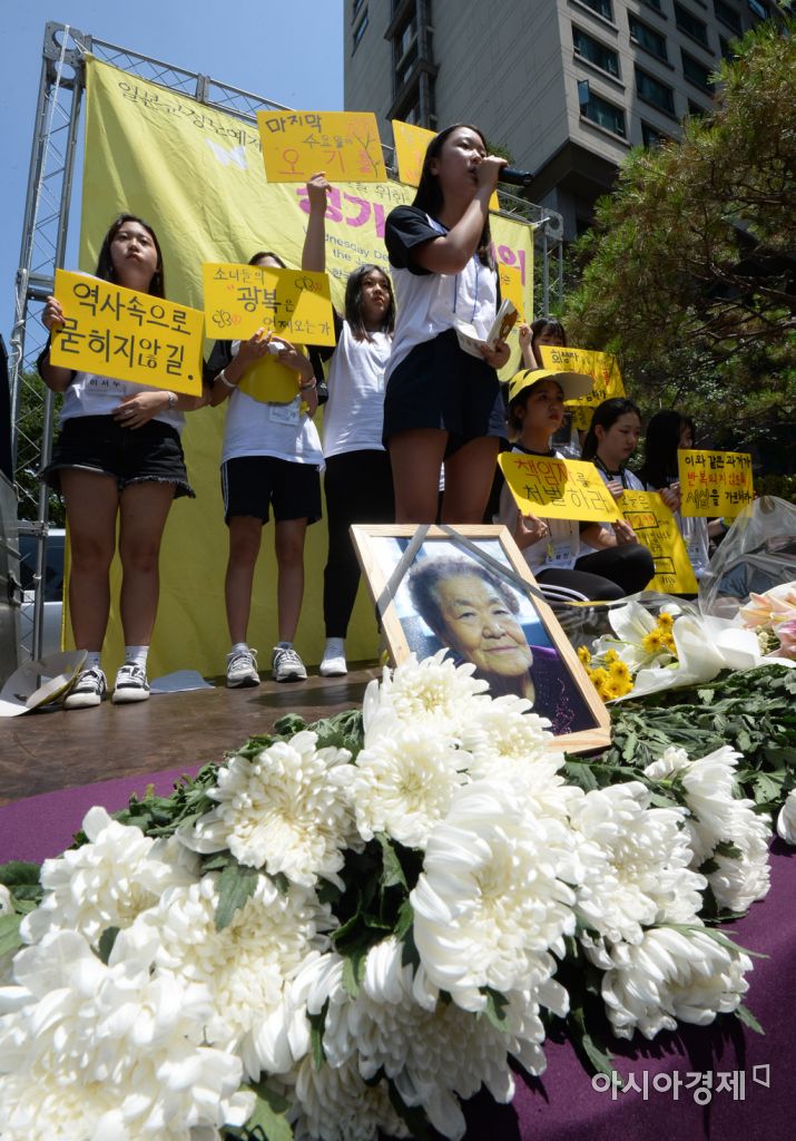 [아시아경제 문호남 기자] 26일 서울 종로구 옛 주한 일본대사관 앞 평화로에서 열린 제1293차 일본군 성노예제 문제해결을 위한 정기 수요시위에 참가한 학생들이 일본 정부의 공식 사죄를 촉구하고 있다. 지난 23일 김군자 할머니의 별세로 정부에 등록된 일본군 위안부 피해 할머니 238명 가운데 생존자는 37명으로 줄었다.문호남 기자 munonam@asiae.co.kr<ⓒ세계를 보는 창 경제를 보는 눈, 아시아경제(www.asiae.co.kr) 무단전재 배포금지>