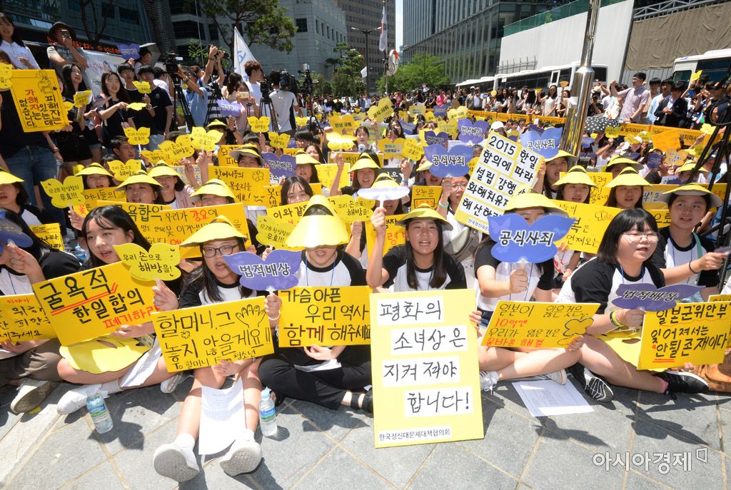 [아시아경제 문호남 기자] 26일 서울 종로구 옛 주한 일본대사관 앞 평화로에서 열린 제1293차 일본군 성노예제 문제해결을 위한 정기 수요시위에 참가한 시민들이 일본 정부의 공식 사죄를 촉구하며 구호를 외치고 있다. 지난 23일 김군자 할머니의 별세로 정부에 등록된 일본군 위안부 피해 할머니 238명 가운데 생존자는 37명으로 줄었다.문호남 기자 munonam@asiae.co.kr<ⓒ세계를 보는 창 경제를 보는 눈, 아시아경제(www.asiae.co.kr) 무단전재 배포금지>