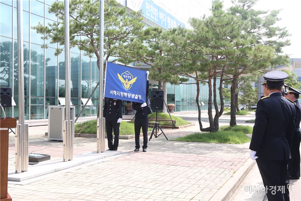 서해지방해양경찰청(청장 고명석)이 정부조직법 개편으로 해양경찰청이 독립함에 따라 26일 오전 10시 목포시 남악1로에 위치한 서해해경 청사에서 소속 총원이 참석한 가운데 ‘현판 제막식과 관서기 게양식’을 가졌다.