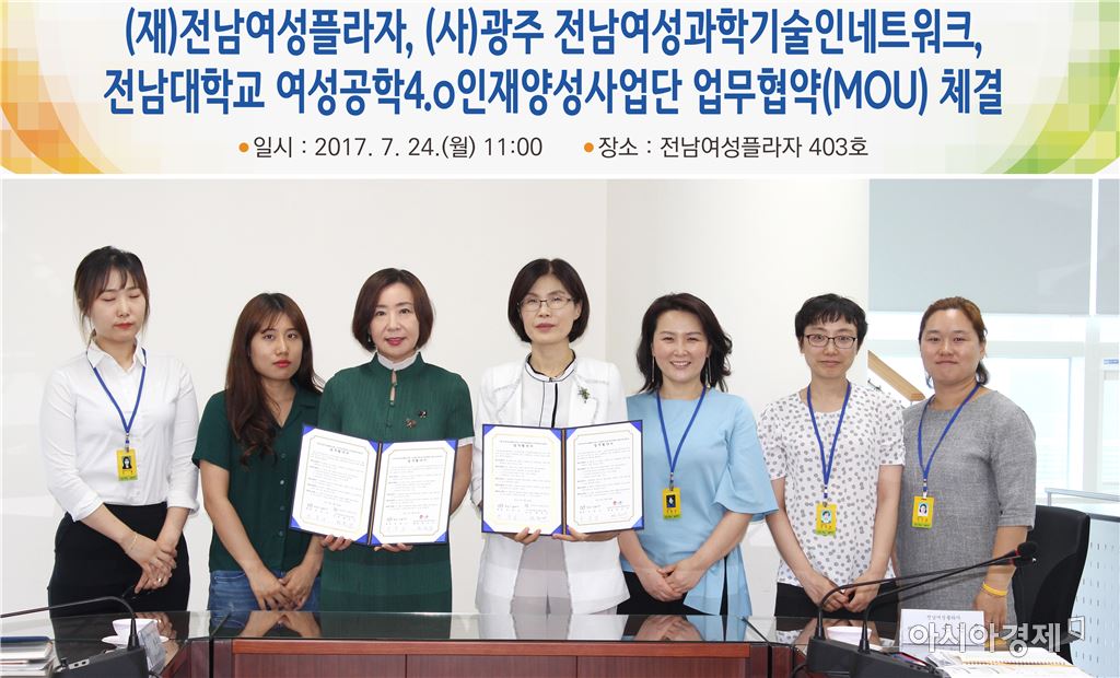 "여성플라자, (사)광주·전남여성과학기술인네트워크 등과 협약" [아시아경제 노해섭 기자]전남여성플라자는 (사)광주·전남여성과학기술인네트워크, 전남대학교 여성공학4.o인재양성사업단과 전남 여성과학기술인의 교류협력 및 네트워크 활성화를 위한 업무협약을 체결했다고 26일 밝혔다.(사)광주·전남여성과학기술인네트워크는 광주·전남 과학기술여성인력의 능력 제고와 활발한 사회 참여 지원을 통해 지역 과학기술의 발전과 보급에 기여할 목적으로 2004년 10월 설립 허가된 여성단체다.전남대학교 여성공학4.o인재양성사업단은 여성 친화적 공학교육시스템 개편을 통해 전공 분야 현장에 필요한 인재양성사업을 추진할 목적으로 2016년 신설된 기관이다.이번 협약은 기관 간 협력을 통해 여성과학기술인의 역량 강화 및 네트워크 활성화, 인적자원 데이터베이스(DB) 교류 및 활용, 협력 분야 지속적 발굴 및 추진을 위해 체결됐다.손문금 전남여성플라자 원장은 “전남지역의 취약한 여성 과학기술인 인재 육성 및 지원 정책 등에 관한 공동 연구와, 여성 과학기술 분야 정보 공유를 통해 여성 과학기술인의 역량 및 대표성 강화에 도움이 되길 바란다”고 말했다.노해섭 기자 nogary@<ⓒ세계를 보는 창 경제를 보는 눈, 아시아경제(www.asiae.co.kr) 무단전재 배포금지>