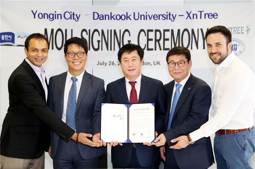 정찬민 용인시장(중앙)이 영국 첨단벤처 육성기업 엑센트리와 협약을 체결한 뒤 기념사진을 찍고 있다.