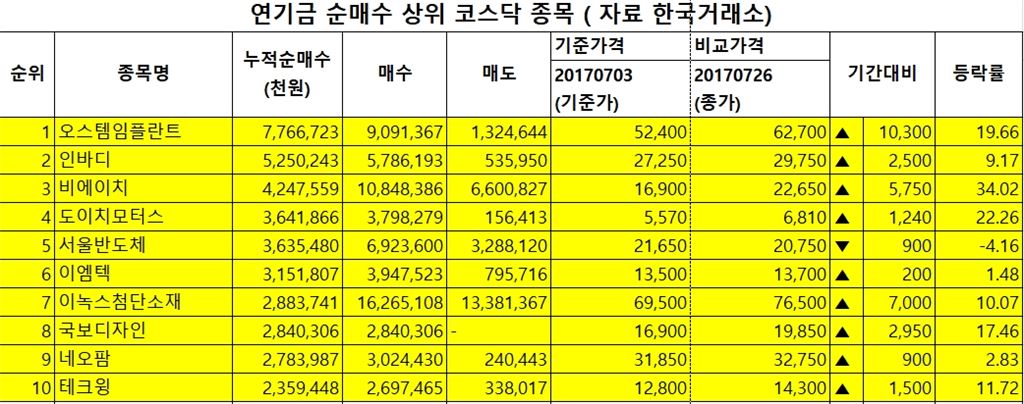 [아시아경제 박미주 기자]최근 코스닥시장에서 연기금이 사들인 종목이 상대적으로 높은 수익률을 보이고 있다. 연기금으로 인한 중소형주 상승 기대감이 커지는 시점이라 주목된다.27일 한국거래소에 따르면 이달 들어 전날까지 연기금이 코스닥시장에서 순매수한 상위 10개 종목의 주가 상승률은 평균 12.45%였다. 같은 기간 코스닥지수 상승률은 0.95%에 그친다. 연기금이 가장 많이 사들인 종목은 오스템임플란트다. 누적 순매수 금액이 77억6600만원에 이른다. 다음으로 인바디(52억5000만원), 비에이치(42억4700만원), 도이치모터스(36억4100만원), 서울반도체(36억3500만원), 이엠텍(31억5100만원), 이녹스첨단소재(28억8300만원), 국보디자인(28억4000만원), 네오팜(27억8300만원), 테크윙(23억5900만원) 등이다.주가가 가장 많이 오른 종목은 34.02% 상승한 비에이치였다. 도이치모터스(22.26%), 오스템임플란트(19.66%), 국보디자인(17.46%), 테크윙(11.72%), 이녹스첨단소재(10.07%) 등도 크게 올랐다. 서울반도체(-4.16%)만 유일하게 하락했다. 이밖에 연기금이 많이 사들인 종목은 HB테크놀러지(20억5300만원), 게임빌(20억2500만원), 하이비젼시스템(19억3000만원), 인터파크홀딩스(18억5400만원), 매일홀딩스(16억8400만원), 동진쎄미켐(16억6300만원), 대명코퍼레이션(16억3700만원), 하나머티리얼즈(15억7100만원) 등이었다.오스템임플란트, 비에이치, 인바디, 도이치모터스, 이엠텍, 네오팜, 테크윙 등은 이달 들어 연기금이 집중 매수하는 종목들이다. 반도체와 헬스케어 관련주들을 주로 담는 것으로 보인다.금융투자업계 관계자는 "전체적으로는 연기금의 코스닥 순매도세가 계속되고 있지만 대형주를 선호하던 강면욱 전 국민연금 기금운용본부장이 사임한 뒤 연기금이 중소형주를 전보다는 더 사들일 것이란 기대감이 있고, 문재인 정부에서 중소기업 위주의 정책을 펴면서 중소형주가 상승할 것으로 기대된다"며 "해당 종목의 주가가 강세를 보이는 데다 향후 코스닥 매매 폭을 넓히는 것을 감안할 필요가 있다. 연기금은 상대적으로 장기간 투자한다는 점도 긍정적"이라고 말했다.박미주 기자 beyond@asiae.co.kr<ⓒ세계를 보는 창 경제를 보는 눈, 아시아경제(www.asiae.co.kr) 무단전재 배포금지>