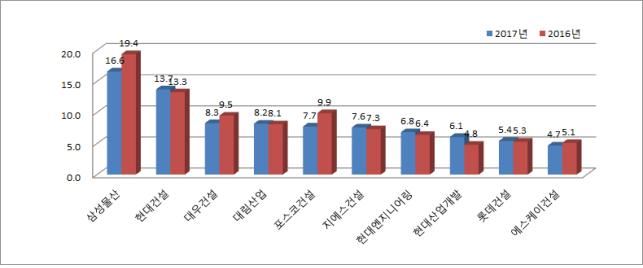 [아시아경제 최대열 기자]삼성물산이 해마다 진행하는 건설사 시공능력평가에서 1위를 차지, 4년 연속 타이틀을 이어갔다. 올해 평가에서는 국내 주택경기 호조로 공사실적이 크게 늘면서 전체적으로 평가액이 올랐다. 삼성물산과 2위 현대건설과의 격차는 지난해 절반 수준으로 좁혀졌다.28일 국토교통부가 발표한 2017년 시공능력평가 결과를 보면, 토목건축공사업에서 삼성물산은 16조5885억원으로 1위를 기록했다. 현대건설은 13조7106억원으로 뒤를 이었다. 삼성물산은 2014년 평가 당시 9년 만에 1위에 오르며 현대건설을 제친 후 4년째 수위를 이어갔다.1ㆍ2위간 격차는 지난해 6조1000억원에서 올해 2조9000억원으로 절반 이상 줄어들었다. 삼성물산은 2015년 제일모직과 합병 후 실적이 합산돼 2위 이하 업체들과 격차를 벌렸지만 이후 국내외 건설수주가 줄고 있어 내년 이후 1위 자리를 지키기 쉽지 않게 됐다. 삼성물산에 따르면 올해 6월 말 기준 수주잔고는 27조8210억원으로 1년 전보다 12조원 이상 줄어들었다.지난해 3위였던 포스코건설은 7조7393억원으로 두계단 하락해 5위로 내려갔다. 반면 대우건설과 대림산업이 한계단씩 상승해 3, 4위에 올랐다. 각각 평가액은 8조3012억원, 8조2835억원으로 집계됐다. 10위권 내에선 현대산업개발이 6조665억원으로 평가돼 2계단 오른 8위에 올랐다. GS건설과 현대엔지니어링이 각각 7조6685억원, 6조8345억원으로 지난해와 같은 순위를 기록했으며 롯데건설과 SK건설은 하나씩 떨어졌다.시공능력평가액이란 발주자가 적정한 건설업체를 정할 수 있는 기준이다. 각 회사의 건설공사실적을 비롯해 경영상태, 기술능력ㆍ신인도 등을 종합적으로 따져 매해 8월부터 새로 적용하고 있다. 발주자는 종합 평가액을 기준으로 입찰을 제한할 수 있고 공공공사를 발주할 때 일정한 제한을 두는 근거로도 활용된다. 30위 이내에서는 삼성엔지니어링이 27계단 뛰어오른 14위로 상승폭이 가장 컸고 부산ㆍ경남지역 주택사업을 기반으로 하는 반도건설, 아이에스동서가 각각 17계단, 15계단 오른 27위, 28위에 올랐다. 반면 두산건설과 두산중공업과 각각 21위, 24위로 떨어졌다.토목과 건축공사 실적을 합한 토목건축공사업의 시공능력평가 총액은 231조6000억원으로 집계됐다. 지난해보다 2.7% 가량 늘었다. 그간 분양시장을 중심으로 한 주택경기 호조로 공사실적평가액이 1년 만에 5.3% 늘었다. 실적평가가 호전되면서 자본금과 매출순이익률 등을 토대로 산출하는 경영평가액이 13.2%나 증가했다. 지난해 기술개발투자비를 산출할 때 세액공제한 금액을 반영하도록 관련 규정이 개정되면서 기술평가액이 12.9%나 줄었지만 실적ㆍ경영평가액이 늘면서 전체 평가액이 올랐다.대형 건설사의 집중도는 다소 올라간 것으로 나타났다. 올해 평가대상인 5만8000여개 건설사 가운데 10대 건설사의 공사실적평가액 비중은 38.6%로 5년 전인 2012년 평가 때와 비교해 5%포인트 가량 늘었다.토목ㆍ건설 외 다른 업종별 순위를 보면, 산업ㆍ환경설비분야에서는 삼성엔지니어링과 GS건설이, 조경분야에서는 제일건설과 대우건설이 각각 1ㆍ2위를 차지했다. 토목 공종별로 1위 업체는 도로의 경우 현대건설, 댐은 SK건설, 지하철은 삼성물산, 상수도는 쌍용건설, 택지용지 조성은 대우건설로 집계됐다. 건축업종 가운데 아파트와 업무시설은 대우건설, 광공업용 건물은 삼성물산이 1위에 올랐다.최대열 기자 dychoi@asiae.co.kr<ⓒ세계를 보는 창 경제를 보는 눈, 아시아경제(www.asiae.co.kr) 무단전재 배포금지>