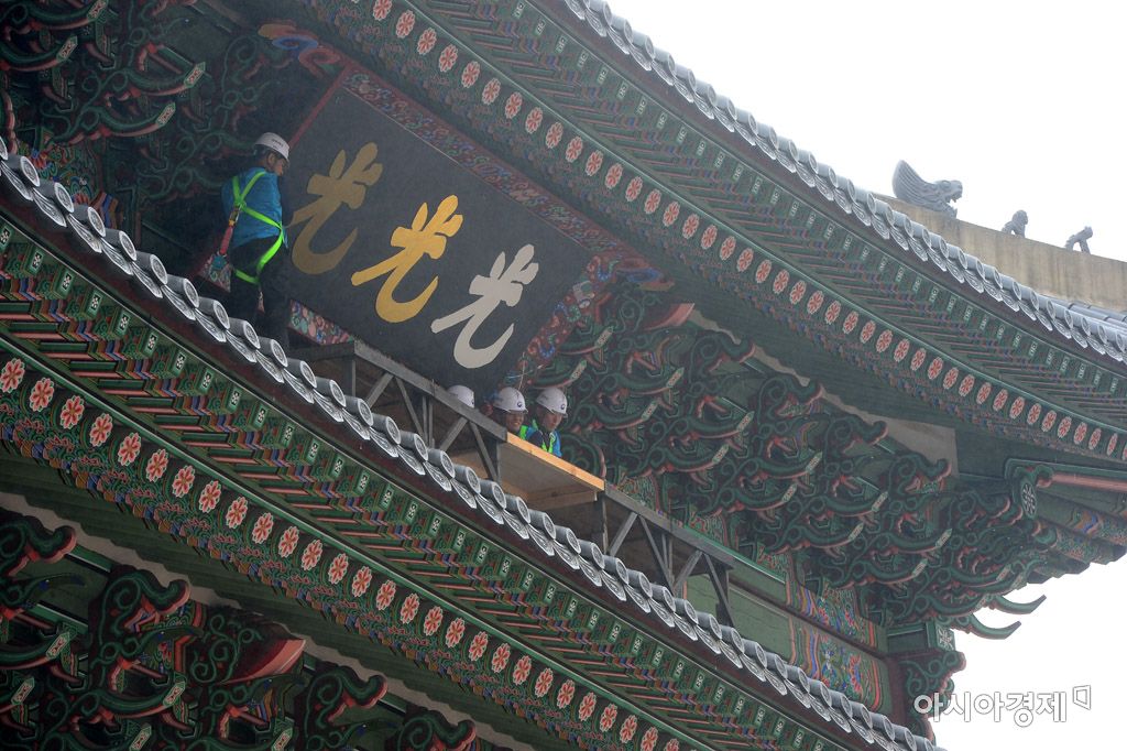 [아시아경제 문호남 기자] 문화재청이 28일 서울 종로구 광화문에서 '광화문 현판 색상 과학적 분석 연구'를 위한 실물 크기 실험용 현판 촬영 작업을 진행하고 있다.문호남 기자 munonam@asiae.co.kr<ⓒ세계를 보는 창 경제를 보는 눈, 아시아경제(www.asiae.co.kr) 무단전재 배포금지>