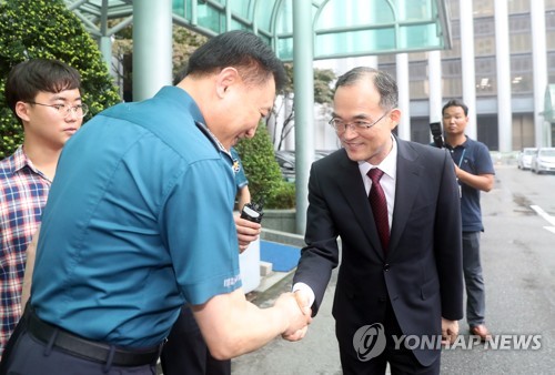 문무일 검찰총장(오른쪽)이 28일 오후 서울 서대문구 경찰청 방문을 마치고 이칠성 경찰청장의 배웅을 받으며 청사를 떠나고 있다. 사진=연합뉴스