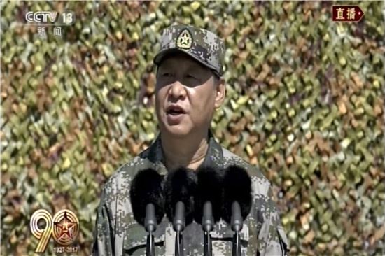 [아시아경제 이혜영 기자] 시진핑(習近平) 중국 국가 주석이 30일 네이멍구(內蒙古) 주르허(朱日和) 훈련기지에서 열린 건군 90주년 열병식에 얼룩무늬 전투복을 입고 참석해 연설하고 있다. 이날 시 주석은 인민해방군에 대한 당의 영도 원칙을 강조하고 영원히 당의 지시에따를 것을 주문했다. 시 주석은 또 "우리 군대는 모든 적을 이길 수 있고 국가 안보와 발전의 이익을 지킬 능력이 있다"고 강조했다.중국군은 이날 신형 대륙간탄도미사일(ICBM) 둥펑(東風·DF)-31AG 등을 포함한 신형 무기를 대거 공개했다. 열병식에는 총 1만여명의 병력과 129대의 항공기, 571대의 군 장비가 동원됐고 이 중 40%가 처음 공개된 장비였다. 이혜영 기자 itsme@asiae.co.kr<ⓒ세계를 보는 창 경제를 보는 눈, 아시아경제(www.asiae.co.kr) 무단전재 배포금지>