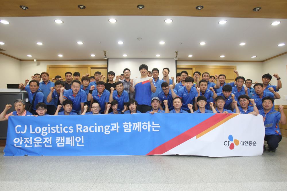 CJ대한통운은 경기도 기흥에 소재한 인재개발센터에서 택배기사 60여명과 황진우 선수가 안전운전을 다짐하며 기념촬영을 하고 있다.<br />