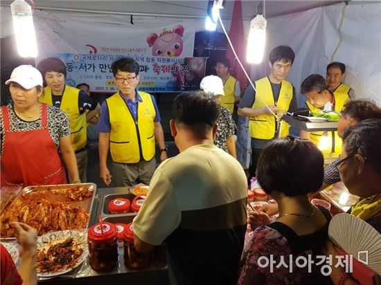 [아시아경제 김재길 기자]전북 부안 농특산물인 젓갈이 경북 포항시 소비자들의 입맛을 사로잡았다.부안군은 지난달 26~30일까지 열린 포항 영일대 해수욕장에서 열린 제14회 포항국제불빛축제 기간에 진서면 대성젓갈이 부안 농특산물 판매부스를 운영해 900여만원의 판매실적을 올렸다고 밝혔다. 이번 판매행사에는 포항지역 5개 로타리클럽(동해·북포항·은하수·해오름·울릉) 유재문 특별대표와 동해로타리클럽 진명찬 회장의 도움이 컸다.동해로타리클럽은 부안 서해로타리클럽(회장 김만호)과 자매결연을 맺고 지속적인 교류활동을 펼치고 있다.특히 양 지역 로타리클럽 회원들은 판매행사가 진행된 포항 영일대 해수욕장에서 매일 10여명씩 부안 농특산물 홍보·판매 자원봉사를 실시하는 등 동서화합을 통한 지역 농특산물 판로 개척의 성공모델을 제시했다.부안군 관계자는 “부안 농특산물 판로 개척을 위해 자매도시 사회단체와 상생 협력할 수 있는 방안을 지속적으로 모색할 계획”이라고 말했다.김재길 기자 <ⓒ세계를 보는 창 경제를 보는 눈, 아시아경제(www.asiae.co.kr) 무단전재 배포금지>