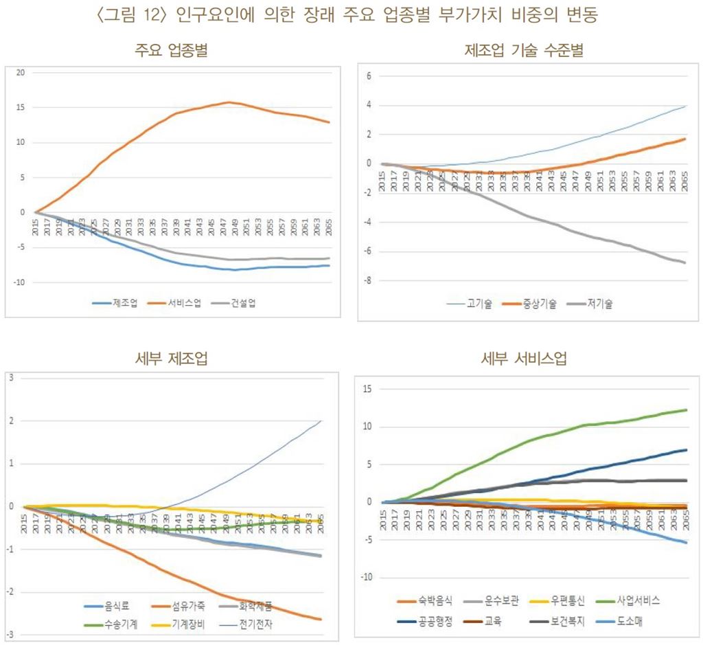 [아시아경제 조은임 기자]고령화 진전으로 서비스업의 부가가치·고용비중이 대폭 늘어날 것이란 전망이 나왔다. 고령인구 비율 상승, 생산가능인구 비율 하락 등 인구구조 변화가 산업구조에 큰 변화를 일으키는 것이다. 한은이 2일 발표한 BOK경제연구 '인구고령화에 따른 우리나라 산업구조 변화'에 따르면 우리나라 인구구조의 변화는 총부가가치(GDP), 고용 측면에서 제조업이 차지하는 비중을 줄이고 서비스업의 비중은 늘리는 방향으로 작용한다. 한은은 경제개별협력기구(OECD) 27개국으로 구성된 패널자료를 이용해 인구구조 변화가 산업구조에 미친 영향을 회귀분석, 이 같은 결과를 냈다. 총부가가치 측면에서 살펴보면 2015년 제조업이 전체 산업에서 차지하는 부가가치 비중은 31%에서 2040년 24%로 줄어든다. 반면 서비스업은 같은 기간 59%에서 73% 늘어날 것으로 추정됐다. 강종구 전 한은 경제연구원 미시제도연구실장(금융연구원 파견)은 "주로 제조업에 대한 소비 수요가 줄어들고 보건복지 부분을 중심으로 서비스업 수요가 늘어나서 산업구조가 변화한다"고 그 배경을 설명했다. 제조업 내에서 특히 섬유· 가죽업과 저기술 제조업 부문의 부가가치 비중이 대폭 줄어들고, 음식료업, 화학제품업, 수송기계업 등도 하락세를 보였다. 서비스업에서는 사업서비스업, 공공행정업, 보건· 복지업 등의 비중이 크게 상승할 것으로 전망됐다. 고용 비중 역시 유사한 흐름을 보일 걸로 예상됐다. 각 업종의 상대적인 생산성 또한 고령화의 진전에 따라 제조업은 하락하고, 서비스업은 상승했다. 저기술 제조업을 중심으로 한 제조업 부문의 상대적 생산성 하락은 제품에 대한 수요와 부가가치가 먼저 감소하고 난 뒤 고용이 점차 줄면서 발생했을 가능성이 높다는 분석이다. 같은 맥락에서 공공행정업, 금융·보험업 등 다수 서비스업종의 상대적 생산성 상승은 수요·부가가치 증가가 있은 후 고용 뒤따라 증가하는데서 기인한다. 부가가치에서 순수출이 차지하는 비중은 고기술 업종을 중심으로 제조업이 상승했다. 이는 제조업 부가가치 창출에서 국내 수요의 기여도가 하락하고 해외수요의 기여도가 높아지는 데 따른 것이다.한은은 인구 고령화에 따라 산업구조가 효율적으로 재편될 수 있도록 유도할 필요가 있다고 강조했다. 수요가 감소하는 저기술 제조업 부문은 구조조정을 지속적으로 추진하며, 보건·복지업, 사업서비스업 등의 경우 수요 증대에 따라 공급능력과 경쟁력을 높여야 한다는 것이다. 조은임 기자 goodnim@asiae.co.kr<ⓒ세계를 보는 창 경제를 보는 눈, 아시아경제(www.asiae.co.kr) 무단전재 배포금지>