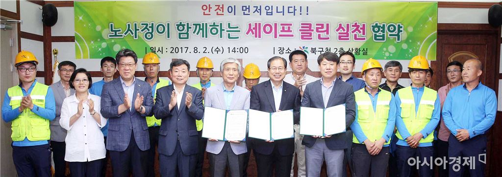 [아시아경제 노해섭 기자]광주시 북구는 2일 구청 2층 상황실에서 송광운 북구청장, 김환국 (주)금광공사 대표이사, 조규진 (주)금광공사 노조위원장, 환경미화원 등 30여명이 참석한 가운데 전국 최초로 청소차량 후미에 매달리지 않기 등 안전한 생활폐기물 수거를 위한 노사정이 함께하는 '세이프 클린 실천'협약식을 가졌다.사진제공=광주시 북구 <ⓒ세계를 보는 창 경제를 보는 눈, 아시아경제(www.asiae.co.kr) 무단전재 배포금지>