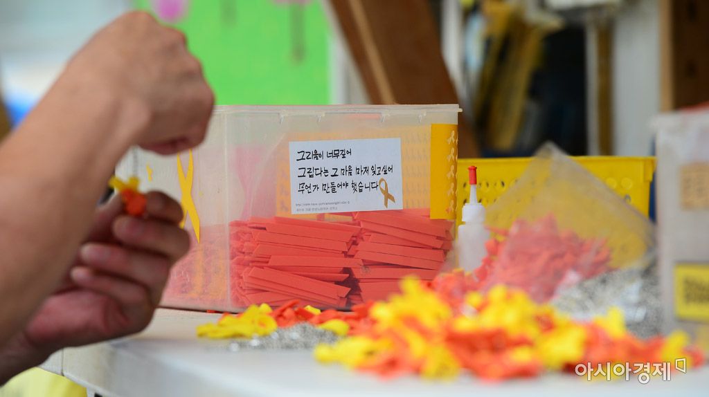 [아시아경제 문호남 기자] 2일 서울 종로구 광화문 세월호 광장에 위치한 노란리본공작소에서 한 자원봉사자가 세월호 노란 리본과 스텔라데이지호 주황 리본을 만들고 있다. 문호남 기자 munonam@asiae.co.kr<ⓒ세계를 보는 창 경제를 보는 눈, 아시아경제(www.asiae.co.kr) 무단전재 배포금지>