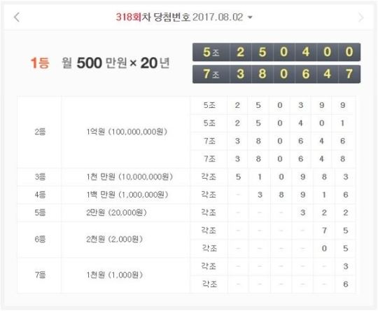 318회차 연금복권 1등 당첨번호가 공개됐다.2일 추첨된 제318회차 '연금복권520'의 1등 당첨번호가 '5조250400'·'7조380647'번으로 결정됐다.연금복권 1등 당첨금은 매월 500만원씩 20년간 연금 형식으로 지급되며 세금을 뺀 실 수령액은 월 390만원 정도다. 연금복권 1등은 22%의 세율이 적용된다.2등 당첨번호는 각 1등 맨 끝자리에 1을 더하고 뺀 '5조250399'번·'5조250401'번·'7조380646'번·'7조380648'번이고 당첨금은 1억원이다.3등 당첨번호는 각조 '510983'번으로 당첨금 1000만원이 주어지고, 100만원이 주어지는 4등 당첨번호는 각조 끝자리 '38916'번이다. 또 5등 당첨번호는 각조 끝자리 '322'번으로 당첨금 2만원, 6등 당첨번호는 각조 끝자리 '05'번과 '75'번으로 당첨금 2000원을 받는다.당첨금 1000원을 받는 7등 당첨번호는 각조 끝자리 '3'번과 '6'번이다.미디어이슈팀 기자 <ⓒ세계를 보는 창 경제를 보는 눈, 아시아경제(www.asiae.co.kr) 무단전재 배포금지>