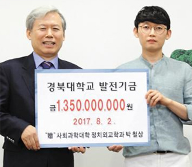 ‘한국의 워런버핏’, ‘청년기부왕’ 등으로 불리는 경북대 박철상씨(33·정치외교학과 4년)가 모교인 경북대에 5년간 장학금 13억5000만원을 기탁했다.2일 경북대에 따르면 박씨는 이날 오후 경북대 김상동 총장을 방문해 복현장학금 기탁식을 가졌다.박씨는 2015년 모교 학생들을 위해 복현장학기금을 설립해 매년 9000만원씩 5년간 4억 5000만원의 장학금을 전달하기로 약정했다. 그러나 이 장학금은 수혜인원을 당초 30명에서 90명으로 늘려 2년 만에 기금이 소진됐다. 학기당 45명, 1년에 90명을 선발해 200만원의 장학금을 지급한 것이다.박씨는 이날 맺은 새로운 약정으로 향후에도 장학금을 계속 전달하게 됐다. 또한 장학생은 90명으로 유지하되 1인당 장학금은 300만원으로 늘었다.박씨는 “쉽지 않은 조건 속에서도 치열하게 살아가는 후배들에게 전하는 저의 고마움과 존경의 표현”이라며 “앞으로도 후배들이 짊어진 짐을 나눠지고 어려움과 고민을 함께할 것”이라고 장학금 기탁 배경을 밝혔다.그는 주식 등 자산운용으로 얻은 수익의 일부를 모교인 경북대를 비롯해 학교와 사회단체 등에 기부하며 지속적으로 나눔을 실천해 ‘한국의 워런 버핏’, ‘청년 기부왕’등의 별명을 얻었다. 그가 지금까지 사회에 환원한 금액은 24억여원에 달한다.아시아경제 티잼 고정호 기자 jhkho2840@asiae.co.kr<ⓒ세계를 보는 창 경제를 보는 눈, 아시아경제(www.asiae.co.kr) 무단전재 배포금지>