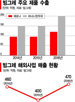 2012년부터 해외로 눈을 돌린 빙그레는 2015년 4월 '해외통'인 박영준 사장의 취임 직후부터 해외사업에 본격적으로 공을 들이기 시작했다. 해외사업 매출액은 2014년 460억원에서 2015년 400억원으로 감소했지만 2016년엔 470억원으로 다시 증가했다. 이 관계자는 "중국법인의 안정화, 동남아(베트남, 필리핀, 싱가포르 등) 시장 개척, 미국 법인 설립 등으로 해외 매출이 회복됐다"며 "수출품목의 다변화와 수출국가 확대 및 현지 영업력 강화를 위한 법인설립 등을 통해 해외사업 확대를 추진할 계획"이라고 설명했다.이선애 기자 lsa@asiae.co.kr<ⓒ세계를 보는 창 경제를 보는 눈, 아시아경제(www.asiae.co.kr) 무단전재 배포금지>