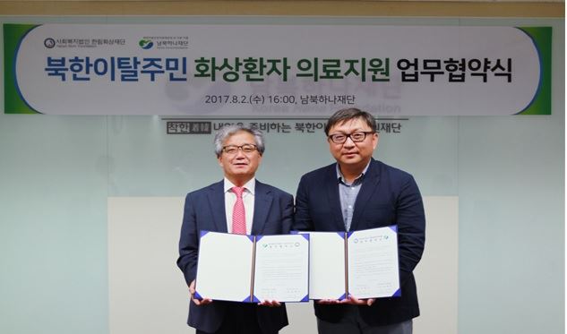 '북한이탈주민 화상환자 의료비 지원을 위한 업무협약' 체결이 이루어진 후 남북하나재단 손광주 이사장(왼쪽)과 한림화상재단 전 욱 운영위원장(오른쪽)이 기념촬영을 하고 있다.