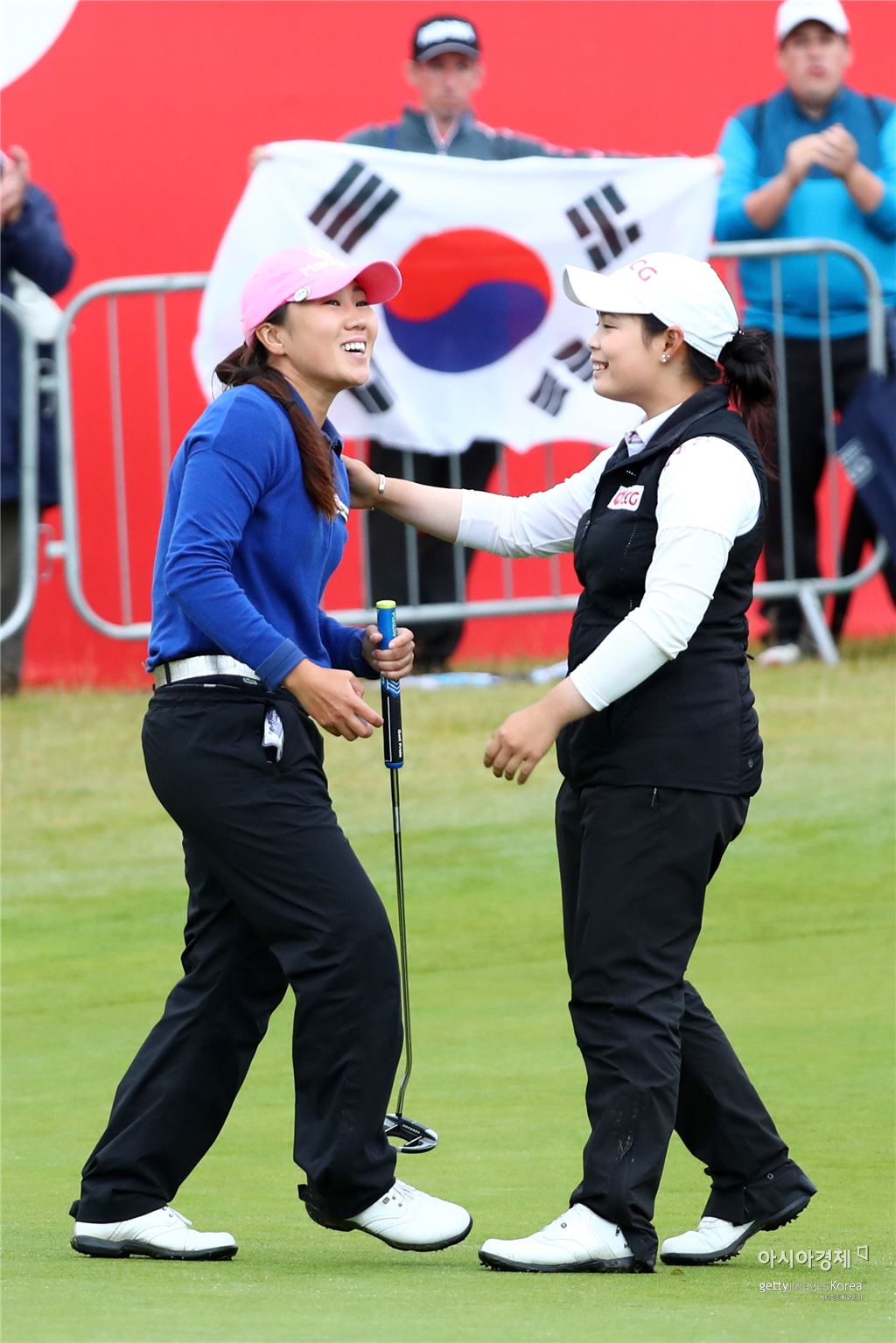 김인경(왼쪽)이 브리티시여자오픈 최종일 18번홀에서 우승 직후 동반 플레이를 펼친 모리야 쭈타누깐의 축하를 받고 있다. 킹스반스(스코틀랜드)=Getty images/멀티비츠