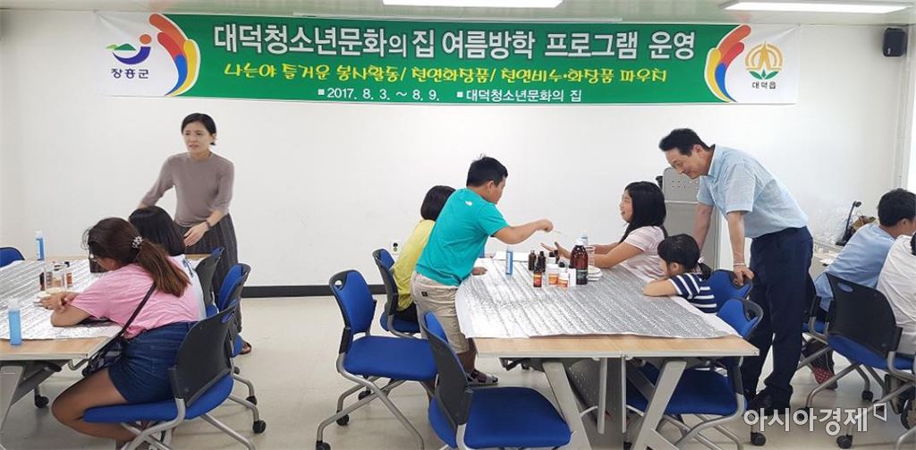 [아시아경제 노해섭 기자]장흥군 대덕읍(읍장 이재천)은 3일부터 9일까지 대덕청소년 문화의집에서 관내 청소년 20명과 함께 청소년 여름방학 프로그램을 운영 중에 있다. 이번 여름방학 프로그램은‘나는야 즐거운 봉사활동’,‘천연화장품 및 천연 비누 만들기’등 다양한 프로그램을 사전에 준비해서 시작 전부터 관내 학생들의 큰 기대를 모으고 있었다. 특히,‘천연화장품 만들기 및 천연비누 만들기’ 과정은 전문 강사를 초빙해 진행함으로써 평소 학생들이 경험해보지 못했던 실습을 해보는 등 호응을 얻었다. 여름방학 프로그램 참여중인 한 학생은 “여름방학 기간동안 청소년문화의 집에서 다양한 프로그램에 참여하여 재미있는 기회가 되고 있으며, 직접 만든 천연화장품은 부모님께 선물하겠다”고 참여 소감을 말했다.노해섭 기자 nogary@<ⓒ세계를 보는 창 경제를 보는 눈, 아시아경제(www.asiae.co.kr) 무단전재 배포금지>