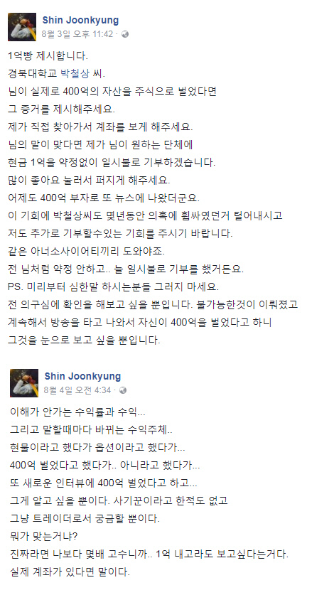 유명 주식투자가 신준경(44)씨가 SNS를 통해 ‘청년 버핏’ 박철상(33·경북대 정치외교학과 4학년)씨의 재산에 대한 의혹을 제기했다.신 씨는 3일 자신의 페이스북에 박 씨의 400억원 재산에 의혹을 제기하는 글을 올렸다. 신 씨는 이 글에 “실제 400억원을 주식으로 벌었다면 직접 계좌를 보게 해달라”고 적었다. 그는 이어 “박씨의 말이 맞다면 박씨가 원하는 단체에 현금 1억원을 약정 없이 일시금으로 기부하겠다”고 제안했다. 이후 그는 제안한 기부금을 1억원에서 3억원으로 늘리기도 했다.신 씨는 지난해 ‘청담동 주식 부자’로 유명세를 떨쳤던 이희진씨의 재산 형성 과정이 의심스럽다며 인증을 요구했던 인물이다.박철상 씨 페이스북 / 사진=박철상 씨 페이스북