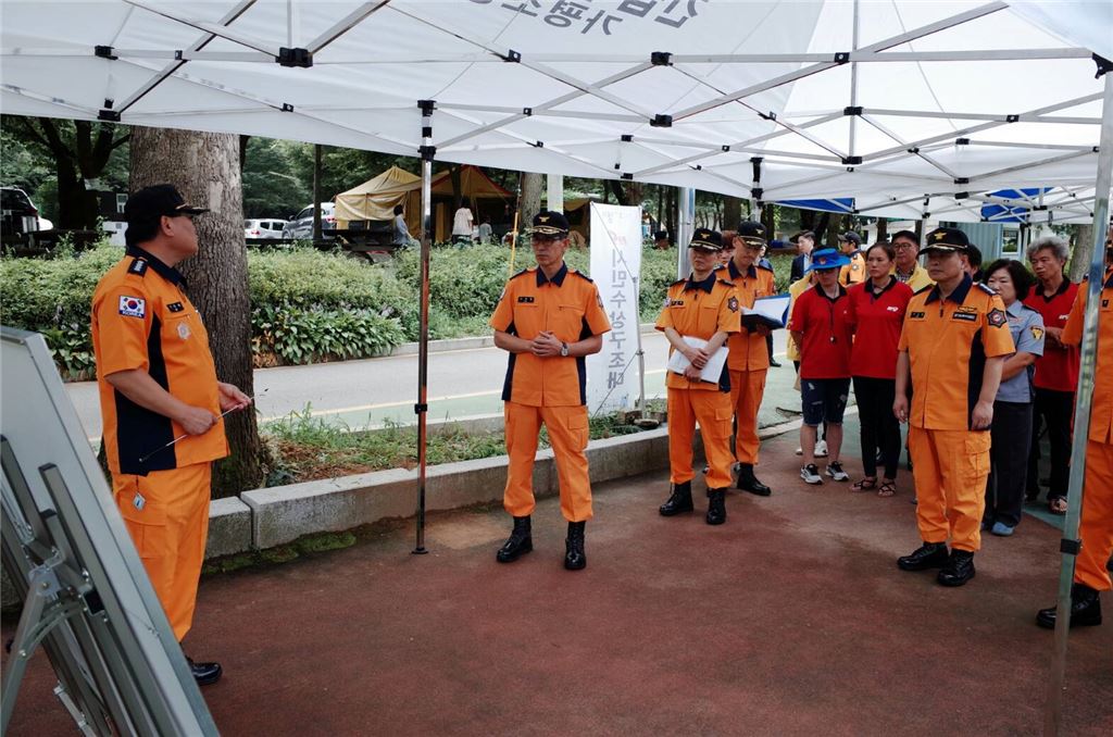 이재열 경기도재난안전본부장이 가평 물놀이시설 현장을 찾아 시설 현황 등에 대해 설명을 듣고 있다.
