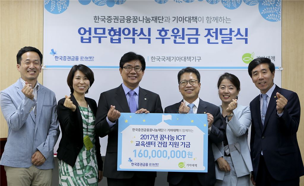 정지원 이사장이(오른쪽에서 세 번째) 9일 한국국제기아대책기구와 라오스 아동들을 위한 '꿈나눔 ICT 교육센터 건립 후원'을 위한 협약을 체결하고 관계자들과 기념촬영을 하고 있다.<br />