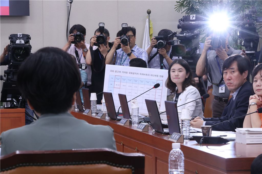 신보라 자유한국당 의원이 11일 김영주 고용노동부장관 후보자를 향해 질의하고 있다. 사진=연합뉴스