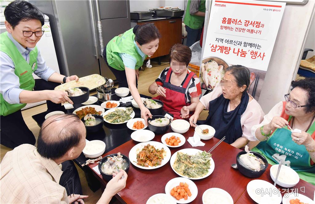 홈플러스 강서점 임직원들이 말복을 맞은 11일 서울 강서구 등촌동 노인복지관에서 독거 노인 30여 명을 모시고 삼계탕을 대접하고 있다.