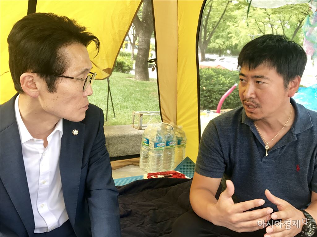 윤소하 정의당 의원이 11일 노승일 전 K스포츠재단 부장의 단식농성장을 찾아 단식 중단을 논의하고 있다. (사진= 정준영 기자)