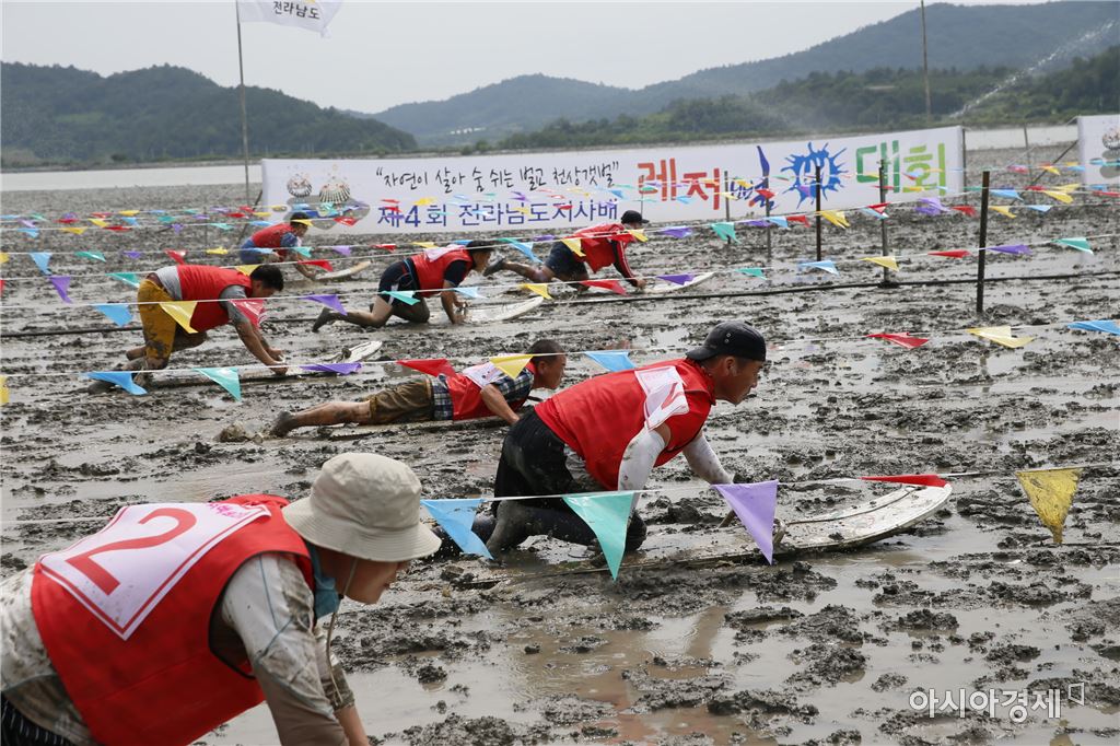 [아시아경제 노해섭 기자]12일 보성군 벌교읍 장양리 어촌체험마을 일원에서 “제4회 전라남도지사배 레저뻘배대회”가 열렸다. 이날 뻘배 레이싱 경기에 참가한 관광객들이 뻘배를 타고 갯벌을 힘차게 달리고 있다. 노해섭 기자 nogary@<ⓒ세계를 보는 창 경제를 보는 눈, 아시아경제(www.asiae.co.kr) 무단전재 배포금지>