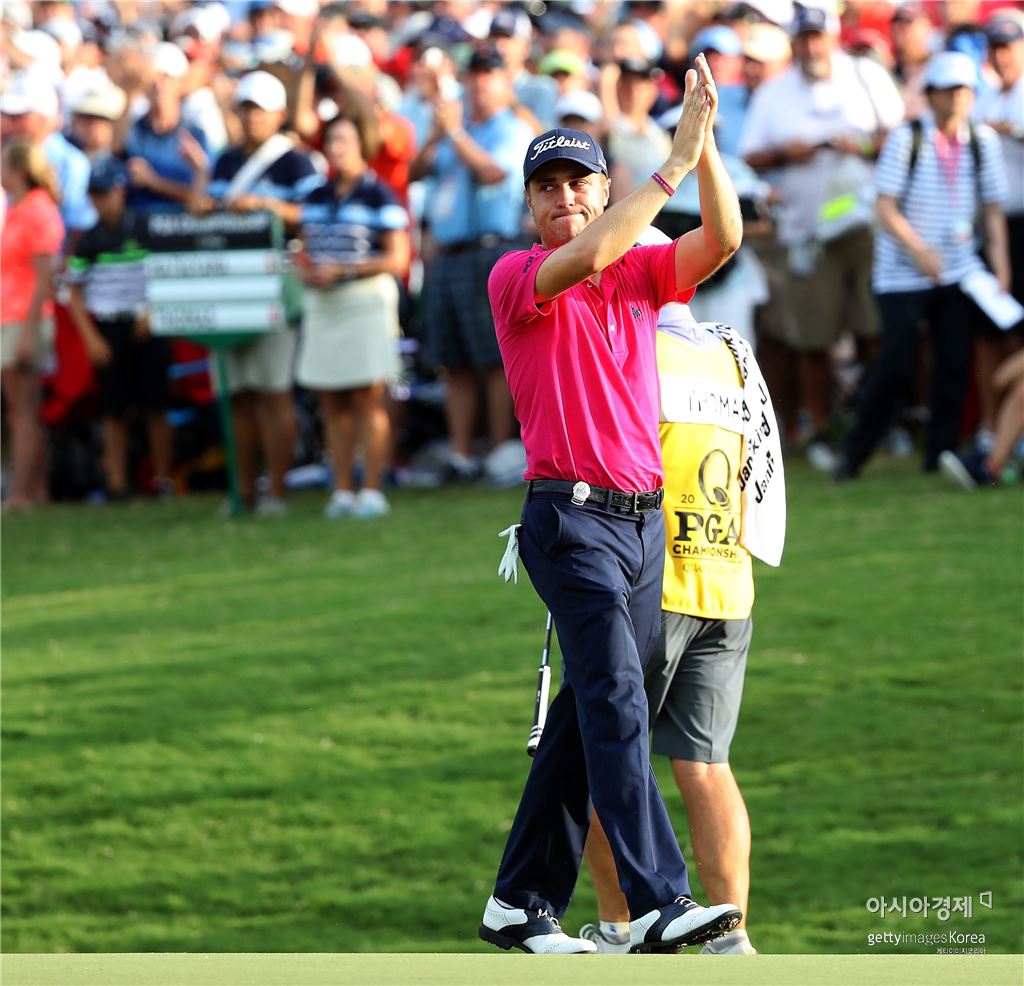 저스틴 토머스가 PGA챔피언십 최종일 우승이 확정되는 순간 환호하고 있다. 샬럿(美 노스캐롤라이나주)=Getty images/멀티비츠