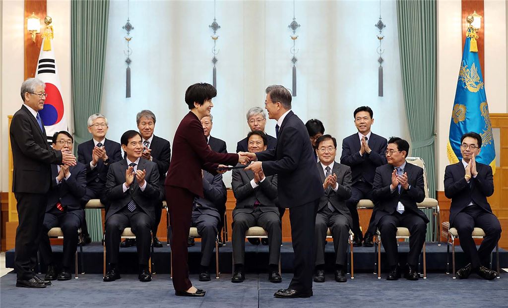 문재인 대통령이 14일 청와대에서 김영주 고용노동부 장관에게 임명장을 수여하고 있다.[사진=청와대]