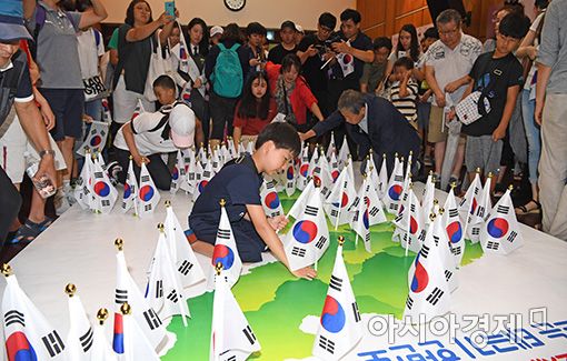 [아시아경제 윤동주 기자] 72주년 광복절인 15일 서울 도산대로 도산공원에서 열린 '1세부터 72세까지 모두 모여 만드는 태극기 한반도' 행사에서 참가자들이 한반도 모형에 태극기를 꽂고 있다.윤동주 기자 doso7@asiae.co.kr<ⓒ세계를 보는 창 경제를 보는 눈, 아시아경제(www.asiae.co.kr) 무단전재 배포금지>