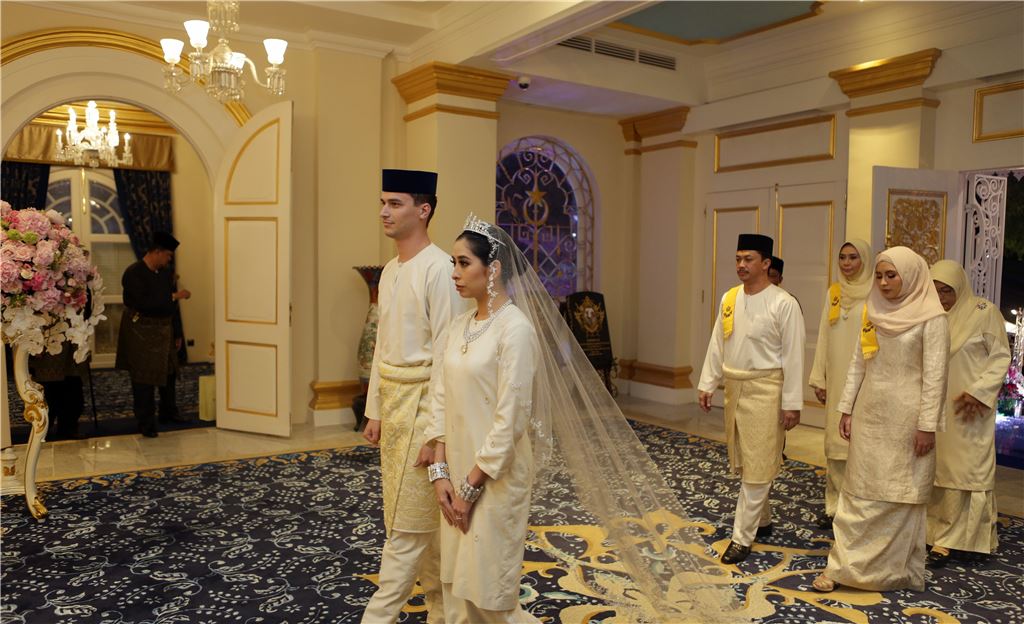 결혼식은 조호르 주 남부 조 왕실 저택 '시린 힐 팰리스'에서 무슬림 말레이 관습에 의해 치러졌다. 대다수 주민이 무슬림인 남부 조호르의 전통 혼례에 맞춰 신랑은 신부에게 22.5링깃(약 6000원)의 지참금을 전달했다. 신랑은 신부 손가락에 반지를 끼워줬고, 부모와 친척들의 손에 입맞춤도 했다. 가족들은 물과 황색 쌀로 이들 부부를 축복했다. 결혼식은 비공개로 진행됐으며 친인척과 친구들만 참석했다.그러나 저녁에 열린 축하연은 약 1200여명이 참석하고, 지역 주민들은 광장에 있는 대형 스크린을 통해 행사를 지켜볼 수 있게 하는 등 공개적으로 진행됐다.(사진출처=EPA연합)
