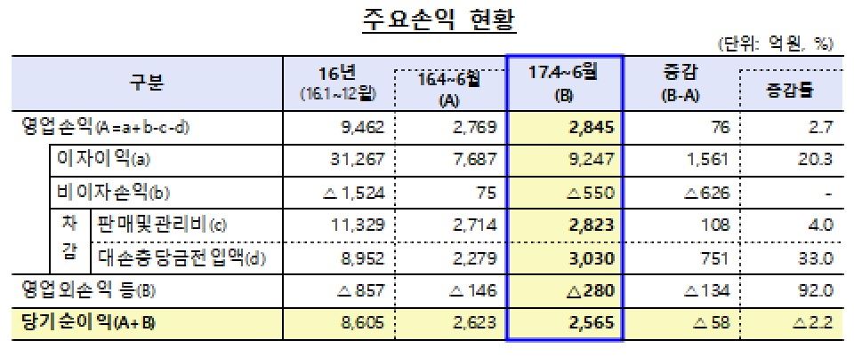 이번 순익 감소는 대손충당금 전입액이 대폭 확대된 영향이 크다고 금감원은 설명했다. 금융당국은 지난 6월 말 '제2금융권 건전성 관리 강화방안'을 시행, 저축은행이 갖고 있는 고위험대출에 추가충당금을 쌓게 됐다. 추가충당금 적립률은 20%에서 50%로 대폭 상향됐고 이에 저축은행 전체 대손충당금 전입액은 지난해 2분기 2279억원에서 올해 3030억원으로 751억원 증가했다.부문별로는 2분기 이자이익이 9247억원으로 전년동기대비 1561억원 늘었다. 대손충당금 확대에 판매관리비도 4%(108억원) 증가하면서 비이자손실이 550억원 났다.자산 지표는 개선됐다. 6월 말 현재 저축은행권 총자산은 55조원으로 지난해 말에 비해 5.1%(2조7000억원) 증가했다.대출금이 3조8000억원 늘어난 반면 현금·예치금, 보유 유가증권은 각각 1조1000억원, 1000억원 줄었다. 연체율은 6월 말 5.2%로 지난해 말에 비해 0.6%포인트 떨어졌다. 다만 기업대출 연체율 가운데 부동산·임대업은 2.2%포인트 상승했고 건설업은 2.0%포인트 하락했다. 가계대출 연체율은 4.5%로 지난해 말에 비해 1.0%포인트 떨어졌다.부실채권 비율을 나타내는 고정이하 여신비율은 지난해 말에 비해 1.1%포인트 오른 6.0%였다.국제결제은행(BIS) 기준 자기자본비율은 6월 말 14.28%로 지난해 말보다 0.33%포인트 하락했다.금감원 관계자는 "앞으로 수익성, 자본적정성이 악화되는 저축은행에 대한 모니터링을 강화하고 고위험대출 추가충당금 적립 등의 영향분석과 건전성 기준 준비상황을 지속적으로 점검하겠다"며 "최고금리 인하로 저신용 계층에 금융애로가 발생하지 않도록 하겠다"고 말했다.정현진 기자 jhj48@asiae.co.kr<ⓒ세계를 보는 창 경제를 보는 눈, 아시아경제(www.asiae.co.kr) 무단전재 배포금지>정현진 기자 jhj48@asiae.co.kr<ⓒ아시아 대표 석간 '아시아경제' (www.newsva.co.kr) 무단전재 배포금지>