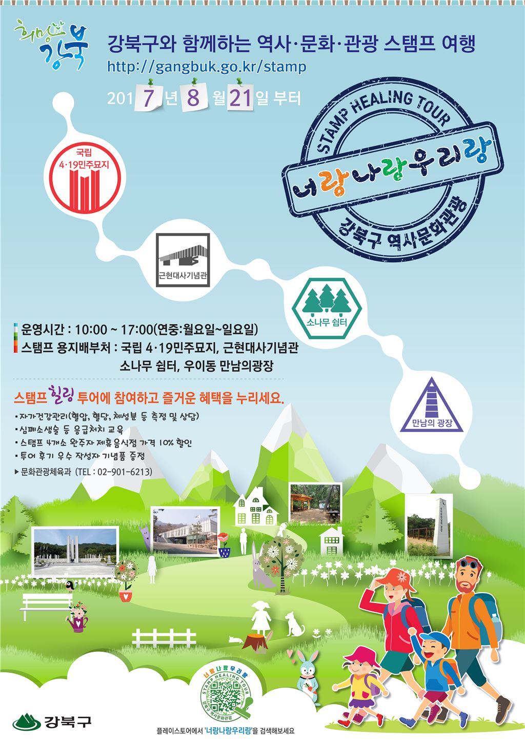 [아시아경제 박종일 기자] 강북구(구청장 박겸수)가 21일 근현대사기념관과 국립4?19민주묘지, 순국선열묘역 일대를 묶어 만든 강북구 역사·문화·관광 스탬프 여행 ‘너랑나랑우리랑 스탬프 힐링투어’를 시작한다.구는 9월2일 우이신설 도시철도 개통에 발맞춰 ‘강북구 역사문화관광 스탬프 힐링투어’를 운영, 강북구를 찾는 주민들에게 역사·문화 체험과 건강을 함께 선물할 예정이다.스탬프 힐링투어는 강북구의 주요 역점사업인 ‘북한산 역사문화관광벨트 조성사업’의 세부사업 중 하나로 국립4.19민주묘지를 시작으로 순국선열 16위 묘지가 있는 초대길을 지나 근현대사기념관, 소나무 쉼터, 우이동 만남의 광장에 이르기까지 강북구의 대표 관광명소들을 둘러 볼 수 있게 기획된 프로그램이다.투어 코스에 있는 관광명소에서 용지를 배부 받아 구간별 4개 스탬프를 모두 날인 후 제휴업소에 제시하면 음식값 등을 할인 받을 수 있다.제휴업소는 투어 코스 주변 음식점 뿐 아니라 롯데백화점 미아점 내에 있는 업소들로 커피쿠폰 무료제공, 식당가·세차장·체형관리·미용실 할인 등 다양한 먹거리와 즐길 거리로 방문객을 맞이할 준비를 하고 있다. 프로그램 운영시간은 연중 오전 10시부터 오후 5시까지이고 각 관광명소에 문화관광해설사가 배치되어 방문객들에게 행사내용 안내 및 역사문화관광 해설을 진행한다. 또 스탬프 투어 참가자를 위해 근현대사기념관과 우이동 만남의 광장에 강북보건소와 연계한 ‘너랑나랑우리랑 건강조은(ZONE)’을 마련, 참가자들의 혈압, 체성분 및 개인별 맞춤형 영양 ? 운동 등 건강상담을 무료로 진행한다.