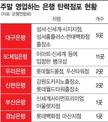 [아시아경제 구채은 기자] #대구에 사는 김모씨는 지난주 토요일 은행 대출을 받아 전세잔금을 치를 수 있었다. 이사날이 토요일로 잡혀 집 입주 시점에 바로 잔금을 치러야 했다. 김씨는 콜센터에 전화해 "토요일에도 근무가 가능한 지점이 있냐"고 물었고 주말영업을 하는 대구은행 성서지점을 찾게 된 것. 김 씨는 "평일엔 점심시간을 다 뺀다해도 은행에 가면 번호표를 뽑아 한참을 기다렸다 업무를 봐야했는데 주말영업을 하는 곳이 있어 무척 편했다"면서 "앞으로도 자주 이용할 것 같다"고 말했다.토요일에도 문을 여는 '주말 은행'이 하나둘 생겨나고 있다. 케이뱅크, 카카오뱅크 등 '24시간 365일' 문여는 인터넷전문은행이 돌풍을 일으키는 상황에서 은행 오프라인 지점의 '새로운 실험'이다. 20일 은행연합회와 금융권에 따르면 주말영업을 하는 은행 탄력점포(공항 환전소, 외국인 근로자 전용 점포 제외)는 총 22곳(출장소 포함). 전체 탄력점포 551개 가운데 4%다. 기존 은행 탄력점포가 공항이나 카지노, 외국인 근로자 전용 점포 등 특수공간으로 한정됐었다. 또 평일 야간 영업을 하는 형태가 많았다. 하지만 최근에는 대형 유통점에서 내국인을 대상으로 한 주말 영업점이 호응을 얻고 있는 것이다.대구은행이 대표적이다. 대구은행 시지지점은 지난 14일부터 토요일 영업을 시작했다. 시간은 오후 1시부터 6시까지. 입출금 업무를 비롯해 신규 예·적금, 환전, 전자금융 등을 이용할 수 있다. 대구은행은 마트 내에 위치한 성서홈플러스 출장소를 토요일에도 영업한 결과 호응도가 높아 시지지점에도 토요영업점을 운영하게 됐다고 설명했다. 대구은행 관계자는 "지방은행의 경우 지역 내 조밀한 점포망을 가지다보니 지역민들의 금융 편의를 높이는 게 중요하다"고 설명했다. 현재 대구은행은 시지지점 외에도 대구 성서지점, 성서홈플러스 출장소, 신세계점, 현대백화점출장소에서 주말영업을 한다. 은행 주말 영업점은 대형유통시설이나 아파트, 상가주변에서 맞벌이 직장인이나 소상공인을 대상으로 영업을 한다. 요일 혹은 일요일에 영업을 하는 은행 점포. 하지만 맞벌이 직장인들의 경우 주말에 문을 여는 은행에 대한 수요가 높고 고객 생활패턴에 맞춘 점포란 점에서 인기가 높다. 은행연합회에 따르면 22곳의 주말 영업 은행 점포 중 SC제일은행의 뱅크샵은 11곳으로 제일 많다. SC제일은행 뱅크샵은 초소형 지점으로 은행직원 2~4명만 상주하며 태블릿PC로 업무를 처리하는 점포다. 2015년 신세계 그룹과 전략적 제휴를 맺어 신세계백화점, 이마트 등에 소형 점포를 만들기 시작했다. 이외에 부산은행(신세계사이먼프리미엄아울렛점)과 경남은행(롯데백화점 마산지점)도 주말 영업점이 각각 1곳 있다. 시중은행의 경우 우리은행 두산타워지점, 롯데월드몰출장소, 신한은행은 강원도카지노출장소, 롯데월드타워출장소 등에 각각 2곳이 입점해있다. 금융권 관계자는 "은행 점포 효율화는 지점 수를 줄여 무조건 폐쇄하는 방향으로 가기 보다는 기존 점포의 가성비를 높이는 방향과 같이 고민되고 있다"면서 "주말영업점도 그러한 고민의 일환 중 하나"라고 말했다. 구채은 기자 faktum@asiae.co.kr<ⓒ세계를 보는 창 경제를 보는 눈, 아시아경제(www.asiae.co.kr) 무단전재 배포금지>