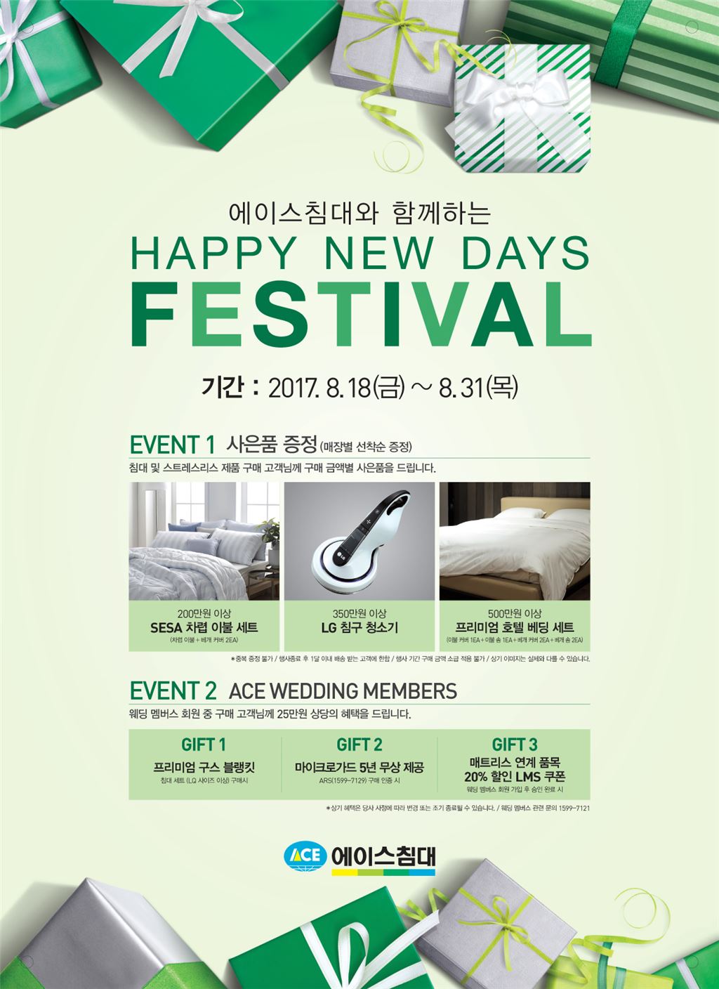 [아시아경제 김유리 기자] 에이스침대는 가을 혼수·이사를 준비하는 이들을 위해 '해피 뉴 데이즈 페스티벌(HAPPY NEW DAYS Festival)'을 진행한다고 17일 밝혔다. 에이스침대는 이번 행사를 통해 에이스침대 및 스트레스리스 제품 구매 고객에게 금액대별로 사은품을 증정한다. 200만원 이상 구매 시 세사(SESA) 차렵 이불 세트를 증정하며 350만원 이상 구매 고객에게는 매트리스 케어가 가능한 LG 침구 청소기를 선물한다. 침실을 호텔처럼 연출하는 '호텔 인테리어' 트렌드에 맞춰 500만원 이상 구매하면 프리미엄 호텔 베딩 세트를 제공한다. 에이스 웨딩멤버스 회원이 제품 구매 시에는 금액대별 사은품과 함께 추가 혜택을 받을 수 있다. 에이스 웨딩멤버스는 결혼을 앞둔 예비부부가 가입할 수 있는 에이스침대 멤버십 프로그램으로 에이스침대 홈페이지에서 가입 가능하다. 웨딩멤버스 가입 즉시 매트리스 연계 품목 20% 할인 혜택을 받을 수 있으며 프리미엄 구스 블랭킷 증정, 마이크로가드 5년 무상 제공 등 총 25만원 상당의 혜택을 추가로 누릴 수 있다. 12월31일까지 에이스침대 매장을 방문에 웨딩멤버스 회원번호를 제시하면 24만원 상당의 신세계면세점 쿠폰북을 추가로 제공받을 수 있다.한편 스트레스리스는 노르웨이에서 100% 생산되는 명품 리클라이너로 신체의 움직임을 읽는듯한 고객맞춤형 편안함과 어떤 콘셉트의 인테리어에도 어울리는 디자인과 다양한 색상이 장점이다. 전 세계 45개국 600만대 이상 판매될 정도로 주목 받고 있으며 국내에서는 에이스침대가 단독 수입해 리클라이너 시장을 개척했다.에이스침대 관계자는 "가을이 다가오며 한 발 앞서 이사·혼수품을 마련하고 있는 소비자들의 행복한 새 출발을 위해 이번 프로모션을 준비했다"며 "다양한 사은품과 혜택으로 풍성한 가을을 맞이하길 바란다"고 말했다.사은품 증정 이벤트는 오는 31일까지 매장별로 선착순 진행되며 자세한 사항은 에이스 홈페이지에서 확인할 수 있다. 김유리 기자 yr61@asiae.co.kr<ⓒ세계를 보는 창 경제를 보는 눈, 아시아경제(www.asiae.co.kr) 무단전재 배포금지>