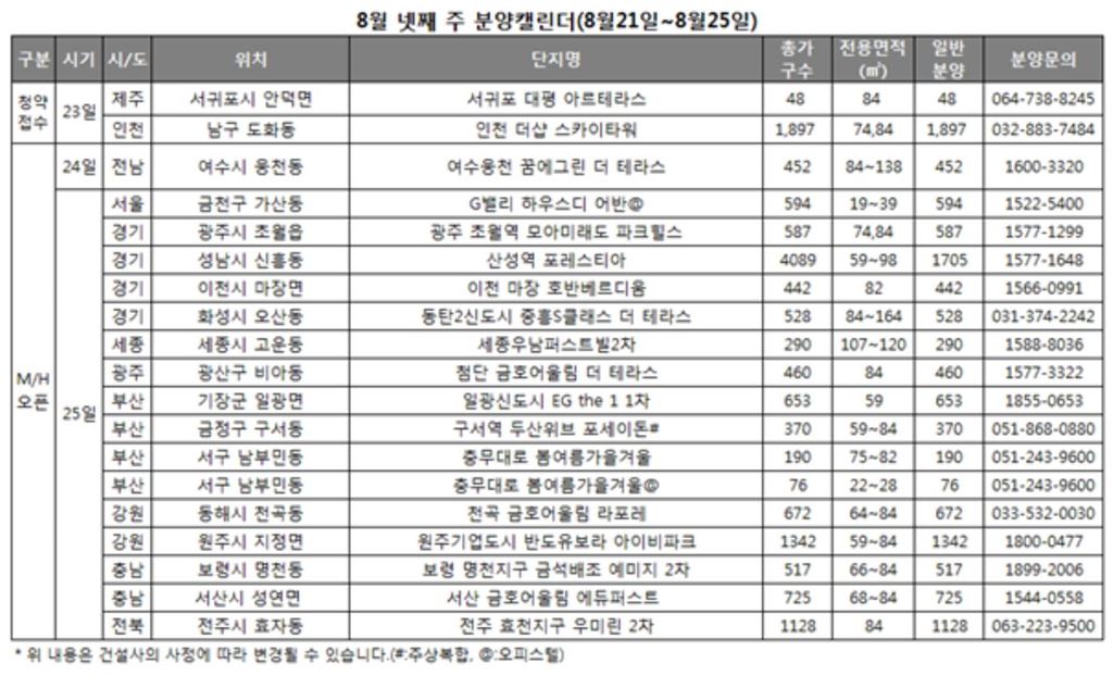 [아시아경제 주상돈 기자] 8월 여름휴가시즌이 마무리단계에 접어들면서 분양시장이 다시 분주해지고 있다. 19일 부동산전문 리서치업체 리얼투데이에 따르면 다음 주엔 전국 각지에서 16곳의 견본주택이 문을 연다. 청약은 총 2곳에서 1945가구(오피스텔 포함)의 청약이 이뤄질 예정이며 당첨자 발표는 9곳, 계약은 4곳에서 진행된다. 우선 오는 23일 포스코건설은 인천시 남구 도화도시개발구역 상업용지 8-5·7블록에 들어서는 '인천 더샵 스카이타워' 1순위 청약을 받는다. 인천 더샵 스카이타워는 지하 4층~지상 최고 49층, 11개동, 총 1897가구 규모로 전용면적 ▲74㎡ 876가구 ▲84㎡ 1021가구로 조성된다. 지하철 1호선 제물포역과 도화역이 인접해 도보로 이용할 수 있고 경인고속도로도화IC와 가좌IC가 3㎞ 이내에 위치해 있어 서울 목동·여의도시청 방면으로의 접근성이 좋다.같은 날 경림종합건설㈜는 제주도 서귀포시 안덕면 창천리 932-3번지 일원에 들어서는 '서귀포 대평 아르테라스' 1순위 청약을 받는다. 서귀포 대평 아르테라스는 지하 1층~지상 4층, 4개동, 전용 84㎡, 총 48가구 규모다. 단지는 중문과 혁신도시, 서귀포 시내 등 도심권으로 출근이 편리한 전원주거단지이다. 도보 5분거리 내에는 서귀포해변과 제주올레길, 군산오름 등 명소들 위치해 있다. 견본주택은 9곳이 새롭게 문을 연다. 오는 25일 반도건설은 강원도 원주시 원주기업도시에 들어서는 '원주기업도시 반도유보라 아이비파크'의 견본주택을 연다. 원주기업도시 반도유보라 아이비파크는 총 2개 블록, 1342가구로 조성된다. ▲1-2블록이 지하 2층~지상 30층, 6개동, 전용 59~84㎡, 548가구 ▲2-2블록은 지하 2층~지상 30층, 8개동, 전용 59~84㎡, 794가구다. 단지는 알파룸은 물론 주방팬트리와 드레스룸, 안방 서재를 제공할 예정이다. 최상층 일부 세대에는 다락공간도 제동된다. 단지 바로 옆으로는 유치원이, 도보권에는 초·중·고교가 개교될 예정이다.같은 날 호반건설은 경기도 이천시 마장면 마장택지개발지구 B3블록에 들어서는 '이천 마장 호반베르디움'의 견본주택을 선보인다. 이천 마장 호반베르디움'(B3블록)은 지하 1층~지상 18층, 8개동, 전용 82㎡, 총 442가구 규모다. 단지는 지역 내 최초 택지지구에서 분양하는 첫 단지다. 단지 인근 도보 통학이 가능한 곳에 초·중·고 학교용지가 위치한다. 또 지구 내 상업시설(예정)과 관공서(예정), 도서관(예정)부지 등이 있다. 인근엔 복하천도 흐른다. 교통여건으로는 경강선(판교~이천~여주) 이천역이 지난해 9월 개통되는 등 서울 및 수도권 진출입 여건이 개선됐다. 이천 마장 호반베르디움은 전 가구를 남향 위주로 배치하고 4베이, 판상형 설계를 적용해 채광과 통풍이 좋다. 가변형 벽체를 적용해 라이프 스타일에 따라 소비자가 원하는 공간 활용이 가능하다.주상돈 기자 don@asiae.co.kr<ⓒ세계를 보는 창 경제를 보는 눈, 아시아경제(www.asiae.co.kr) 무단전재 배포금지>