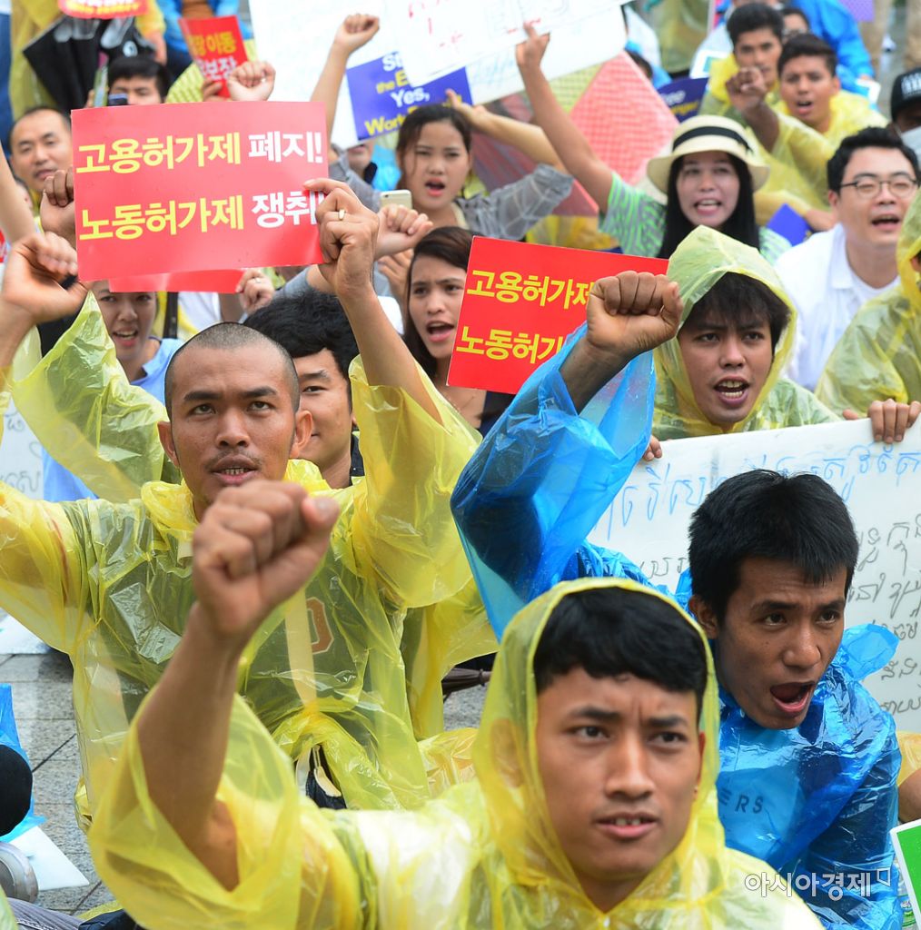 [아시아경제 문호남 기자] 전국 이주노동자들이 20일 서울 종로구 보신각 앞에서 열린 전국 이주노동자 결의대회에서 노동기본권 보장 및 고용허가제 폐지 등을 촉구하며 구호를 외치고 있다.문호남 기자 munonam@asiae.co.kr<ⓒ세계를 보는 창 경제를 보는 눈, 아시아경제(www.asiae.co.kr) 무단전재 배포금지>