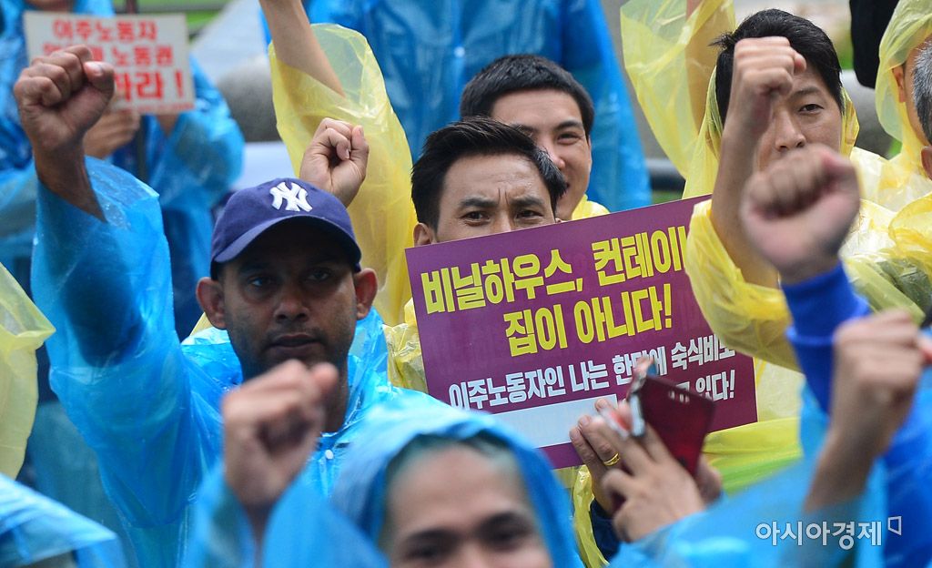 [아시아경제 문호남 기자] 전국 이주노동자들이 20일 서울 종로구 보신각 앞에서 열린 전국 이주노동자 결의대회에서 노동기본권 보장 및 고용허가제 폐지 등을 촉구하며 구호를 외치고 있다.문호남 기자 munonam@asiae.co.kr<ⓒ세계를 보는 창 경제를 보는 눈, 아시아경제(www.asiae.co.kr) 무단전재 배포금지>
