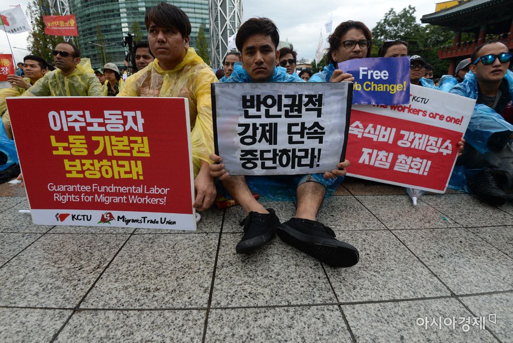 [아시아경제 문호남 기자] 전국 이주노동자들이 20일 서울 종로구 보신각 앞에서 열린 전국 이주노동자 결의대회에서 비가 내리는 궂은 날씨 속 노동기본권 보장 및 고용허가제 폐지 등을 촉구하고 있다.문호남 기자 munonam@asiae.co.kr<ⓒ세계를 보는 창 경제를 보는 눈, 아시아경제(www.asiae.co.kr) 무단전재 배포금지>