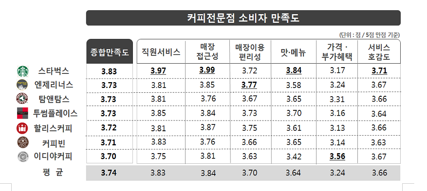 커피전문점 만족도, 스타벅스가 가장 높아2015년에 비해 엔제리너스, 탐앤탐스 등 소비자만족도 상승 [아시아경제 지연진 기자]국내 소비자들의 만족도가 가장 높은 커피전문점은 스타벅스커피코리아인 것으로 나타났다. 매장접근성을 비롯해 직원서비스, 맛과 서비스 호감도 등 전 부문에서 골고루 높은 점수를 받았다. 21일 한국소비자원이 스타벅스, 엔제리너스, 이디야커피, 커피빈, 탐앤탐스, 투썸플레이스, 할리스커피 등 시장점유율 상위 7개 커피전문점에 대한 소비자 만족도를 조사한 결과 스타벅스의 만족도가 가장 높은 것으로 나타났다. 커피전문점 이용자 1000명을 대상으로 조사한 결과, 소비자만족도가 전반적으로 2015년에 비해 높아진 것으로 나타났다.매장접근성'(3.84점), '직원서비스'(3.83점), '매장이용 편리성'(3.70점) 만족도는 높은 반면, '가격ㆍ부가혜택' (3.24점) 만족도는 상대적으로 낮은 것으로 나타났다. '매장접근성', '직원서비스', '맛ㆍ메뉴', '서비스 호감도'에서는 스타벅스가 높은 평가를 받았으며, '매장이용 편리성' 만족도는 엔제리너스가, '가격ㆍ부가혜택' 만족도는 이디야커피가 상대적으로 높았다.커피전문점의 종합만족도는 평균 3.74점로 이는 2015년보다 0.06점 상승한 수치이며 특히 '직원서비스' 부문에서 높은 상승을 보였다. 한국소비자원은 "소비자원의 주기적인 소비자 만족도 조사를 통해 사업자들이 자체 교육을 강화하고 서비스 품질 개선을 위해 노력한 결과"라고 설명했다.(자료-한국소비자원)