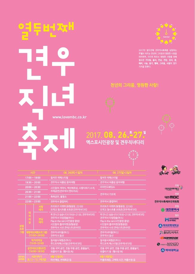 [아시아경제(대전) 정일웅 기자] 견우와 직녀 이야기를 모티브로 한 여름 축제가 대전엑스포시민광장에서 열린다.대전시는 오는 26일부터 이틀간 엑스포시민광장에서 ‘제12회 견우직녀 축제’를 연다고 21일 밝혔다.‘천년의 그리움, 영원한 사랑!’을 주제로 진행될 이 축제는 여름철 가족, 연인, 친구 관계의 시민들이 도심에서 문화행사를 체험할 수 있게 한다.일자별 프로그램에서 첫 날은 80세 이상(결혼생활 50년 이상)의 부부를 찾아 ‘백년해로 상’을 시상하고 견우와 직녀 설화를 판타지로 재현한 주제공연, 크라잉넛·조승구 등 대중가수의 특별축하공연, 불꽃쇼 등을 선보이는 형태로 채워진다.이어 둘째 날은 결혼 10년차 이상의 부부 다섯 쌍이 무대에 오르는 ‘견우직녀 리마인드 웨딩’ 이벤트와 견우직녀 가요제, 지역 가수 초청 축하공연, 현장에서 모집한 성인 남녀가 참여하는 ‘견우직녀 클럽파티’ 등이 다채롭게 진행될 예정이다. 이밖에 시는 축제 기간 중 오후 3시~10시까지 시민광장 무빙쉘터 아래에서 ‘견우직녀 체험마을’ 부스, 한밭수목원 원형동산 주변에선 ‘플리마켓’을 각각 설치·운영한다. 또 행사장 내 ‘견우직녀 타임캡슐’과 ‘청사초롱 포토존’, 푸드트럭페스티벌‘ 등의 프로그램을 양일에 걸쳐 진행할 예정이다. 견우직녀축제에 관한 기타 자세한 내용은 대전문화재단 홈페이지 또는 대전문화방송 홈페이지를 참조하거나 대전문화재단 시민문화지원팀(042-480-1072)을 통해 안내받을 수 있다.대전=정일웅 기자 jiw3061@asiae.co.kr<ⓒ세계를 보는 창 경제를 보는 눈, 아시아경제(www.asiae.co.kr) 무단전재 배포금지>정일웅 기자 jiw3061@asiae.co.kr<ⓒ아시아 대표 석간 '아시아경제' (www.newsva.co.kr) 무단전재 배포금지>