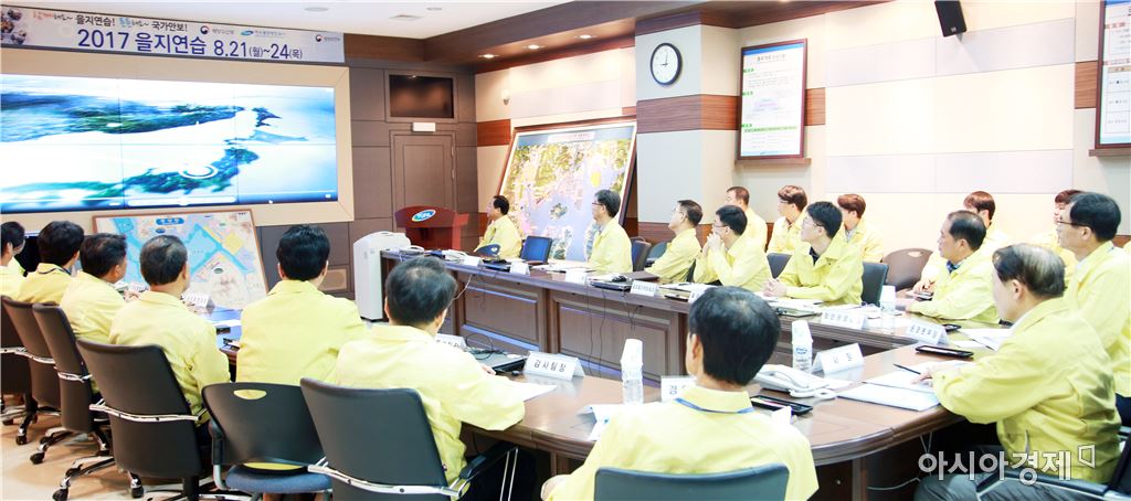 을지훈련이 시작된 21일 광양항 월드마린센터 1층 상황실에서 방희석 여수광양항만공사 사장이 최초 상황보고회의를 주재하고 있다.