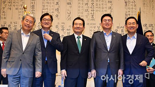 [아시아경제 윤동주 기자] 정세균 국회의장과 교섭단체 4당 원내대표가 21일 국회에서 만나 회동을 갖기에 앞서 포즈를 취하고 있다. 김동철 국민의당(왼쪽부터), 우원식 더불어민주당, 정 의장, 정우택 자유한국당, 주호영 바른정당 원내대표.윤동주 기자 doso7@asiae.co.kr<ⓒ세계를 보는 창 경제를 보는 눈, 아시아경제(www.asiae.co.kr) 무단전재 배포금지>