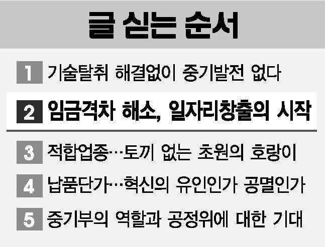 [아시아경제 정동훈 기자] #중소기업 A는 지난해 스마트공장을 도입했다. 불량이 자주 생기는 생산 라인을 개선하기 위해서였다. 자동화에 성공한 뒤 생산성이 20% 올라갔고 원가를 15% 낮출 수 있었다. 임직원들의 기대감이 컸다. 하지만 원청 대기업은 공장을 실사하더니 "원가를 낮춘 만큼 납품단가도 내리겠다"고 통보했다. 날벼락이었다. A사 대표는 "납품단가 후려치기를 막을 수 없는데 어떻게 중소기업에 혁신을 기대할 수 있냐"며 "근로자들의 임금도 납품 단가에 볼모처럼 매여 있다"고 토로했다. 납품단가 후려치기는 대ㆍ중기 간 임금격차를 심화시킨다. 중소기업 혁신의 과실을 대기업이 가져가는 것이기 때문이다. 임금인상 여력이 없는 중소기업에 청년들은 눈길을 주지 않는다. 인재가 없는 중소기업은 혁신에 실패하고 시장에서 퇴출된다. 우리 경제의 모든 성과가 대기업으로 빨려 들어가는 현실을 바로잡지 않고선 일자리 창출도, 중기 활성화도 불가능하다.◆임금격차가 시장경제 역동성 저해= 구직난과 구인난이 공존하는 나라. 청년들은 취직을 못해 발을 동동 구르고 중소기업은 직원을 못 뽑아 애간장을 태운다. 일자리 수요ㆍ공급이 일치하지 않는 '일자리 미스매칭'은 우리 중소기업계의 고질적 문제다. 가장 주요한 원인은 역시 '임금'이다. 최근 한국경제연구원이 발표한 '2016년 임금근로자 연봉 분석' 자료에 따르면 대기업 정규직 근로자의 평균 연봉은 6521만원, 중소기업은 3493만원으로 거의 두 배 차이다. 사내복지 제도까지 고려하면 격차는 더 커진다.대기업의 고용 창출력이 낮아지는 현실은 문제의 심각성을 더한다. 통계청의 고용지표 분석에 따르면 올해 1월 근로자 300인 이상 대기업 취업자는 241만6000명으로 1년 전 같은 달보다 4만6000명 줄었다. 글로벌 금융위기 여파로 고용 시장이 얼어붙은 2010년 9월(마이너스 6만명) 이후 가장 큰 감소폭이다. 저성장ㆍ뉴노멀 시대, '괜찮은' 일자리는 결국 중소기업에서 나온다. 규모가 작은 기업은 발빠르게 신성장 산업에 뛰어들고 혁신을 통해 새로운 일자리를 만들 수 있다. 정부는 중소기업이 2명을 신규 채용하면 세번째 채용자에 대해 3년간 임금 전액을 지원하는 '추가고용지원제도'를 약속하고 추진 중에 있다. 하지만 이 같은 지원책은 응급처방일 뿐 문제의 본질을 해결하는 데 역부족이라는 지적이 많다.◆'새털처럼 가벼운' 中企지갑 채우려면= 대ㆍ중기 임금격차의 본질은 납품단가다. 김혜정 충남연구원 연구원은 '위탁대기업과 협력중소기업 간 임금격차 확대 영향요인'이란 논문을 통해 대기업 근로자의 임금이 오르면 납품생산물 구매비용이 하락하고, 이는 납품단가를 낮춰 결국 협력 중소기업의 상대임금을 떨어뜨린다는 연구 결과를 밝혔다. 일부 대기업 노동조합의 지나친 임금인상 요구 역시 이런 구조를 공고화하는 데 기여한다는 시각도 있다.한국개발연구원(KDI)은 지난해 '하도급 공정거래와 대ㆍ중소기업 격차 완화' 자료를 통해 대ㆍ중소기업의 임금격차 문제의 근본적 해법은 원ㆍ하청 불공정거래 관행 개선에 있다고 지적했다. KDI에 따르면 원청 대기업 A사 근로자가 B사 근로자보다 평균 연봉을 100만원 더 받는다고 했을 때, A사 하도급업체의 임금은 B사 하도급업체보다 겨우 6700원 더 많았다. 원청기업이 이익을 많이 내더라도 하도급업체에게는 제대로 전달되지 않는다는 증거다.임금격차를 좁히기 위한 대안 중 하나로 '성과공유제'가 꼽히지만 대기업의 참여는 소극적인 편이다. 성과공유제는 대기업과 중소기업이 원가절감ㆍ납기단축ㆍ품질향상 등 공동 목표를 설정해 노력하고 그 결과에 따라 현금보상, 장기계약권 부여 등으로 성과를 공유하는 방식으로 진행된다. 동반성장위원회에 따르면 최근 5년간 성과공유제 도입기업은 2012년 77개사에서 지난해 245개까지 늘었다지만 아직은 초기 단계다. 동반성장위원회 관계자는 "대기업에게 세제혜택 등 인센티브를 확대해 참여를 유도할 필요가 있다"고 말했다.한발 더 나아가 '초과이익공유제'의 법제화가 필요하다는 주장도 나온다. 초과이익공유제란 대기업이 해마다 설정한 목표를 초과하는 이익을 달성하면 협력 중소기업에게 초과이익의 일부를 나누는 제도다. 지난해 6월 국회 김경수 더불어민주당 의원이 초과이익공유제의 법제화를 뼈대로 하는 '대ㆍ중소기업 상생협력 촉진에 관한 법률' 개정안을 대표 발의했다. 김기찬 가톨릭대 경영학과 교수는 "초과이익공유제는 기울어진 한국경제 구조를 바로잡는 데 도움이 될 수 있지만 자칫 기업의 혁신을 가로막는 방향으로 변질될 수도 있다"며 "초과이익이라는 기준도 애매하기 때문에 제도를 섬세하게 가다듬고 여론을 수렴해야 한다"고 밝혔다.인력정보가 부족한 중소기업을 위해 대학과 기업을 아우르는 '통합 정보플랫폼'을 구축하는 것도 도움이 될 수 있다. 현재 고용노동부가 운영하는 고용정보 시스템 '워크넷'이 있는데 이를 확대ㆍ개선해야 한다. 중소기업이 몰린 산업단지의 정주 공간도 구직자들의 눈높이에 맞춰 개선할 필요가 있다. 산업단지 노후화는 청년층이 중기 취업을 외면하는 주요 원인이