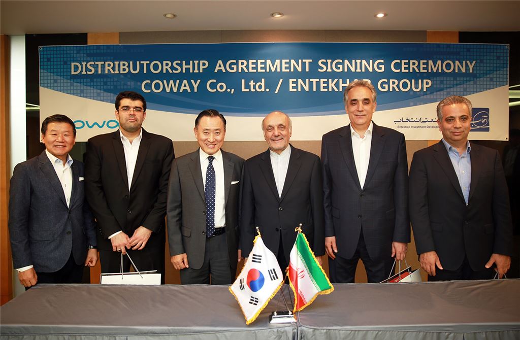 이해선 코웨이 대표(왼쪽 세 번째)와 모하메드 카리미안 엔텍합투자그룹 부사장(왼쪽 두 번째), 하산 타헤리안 주한 이란대사(왼쪽 네 번째)가 상호제품 독점판매계약 체결식에 참석해 관계자들과 기념촬영을 하고 있다.