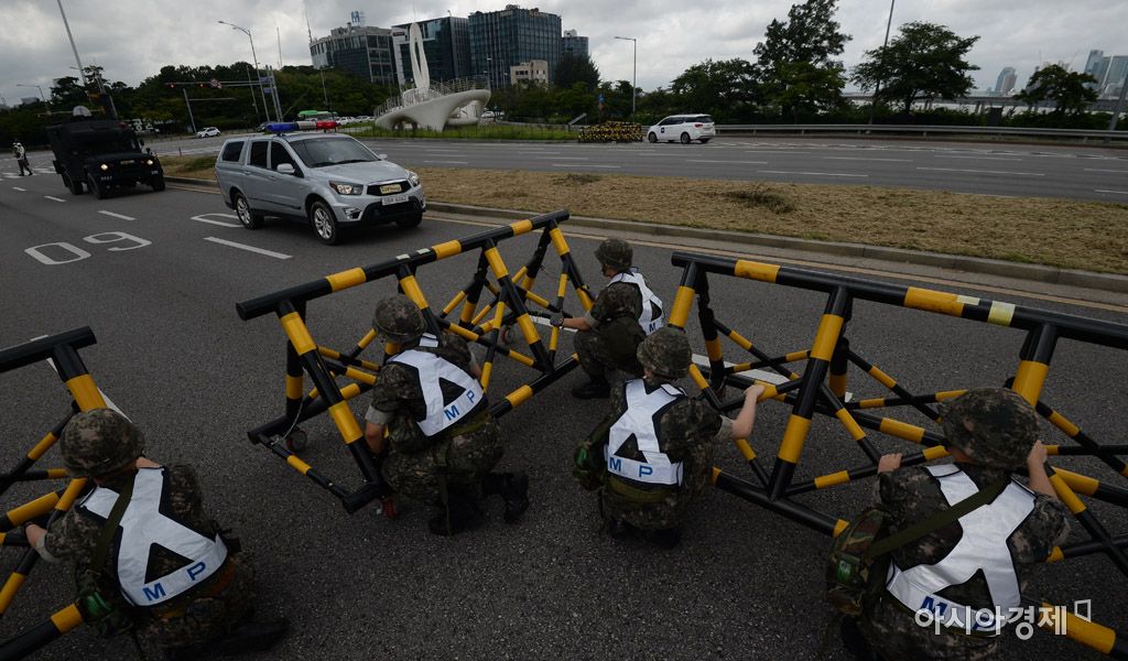 [아시아경제 문호남 기자] 을지연습과 연계한 민방공대피훈련이 실시된 23일 서울 마포대교에서 군·경이 합동으로 '전시 교통통제소 설치 훈련'을 하고 있다.문호남 기자 munonam@asiae.co.kr<ⓒ세계를 보는 창 경제를 보는 눈, 아시아경제(www.asiae.co.kr) 무단전재 배포금지>