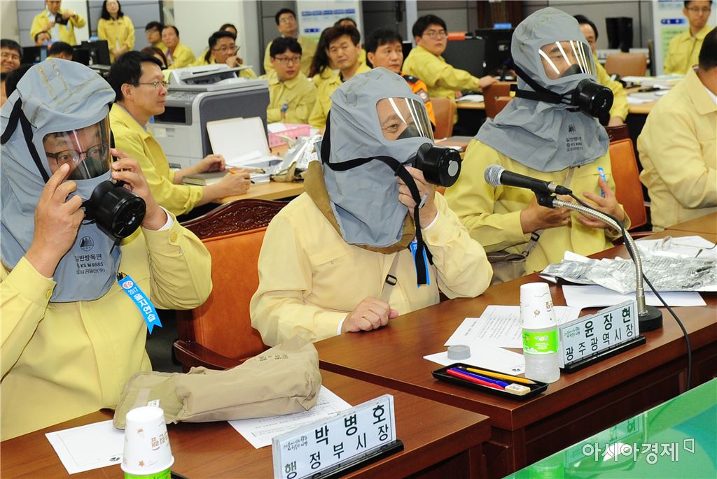 [아시아경제 노해섭 기자]윤장현 광주광역시장이 23일 오후 시청 충무시설에서 ‘을지연습 도상연습평가’에 참석해 방독면 시연을 하고 있다.